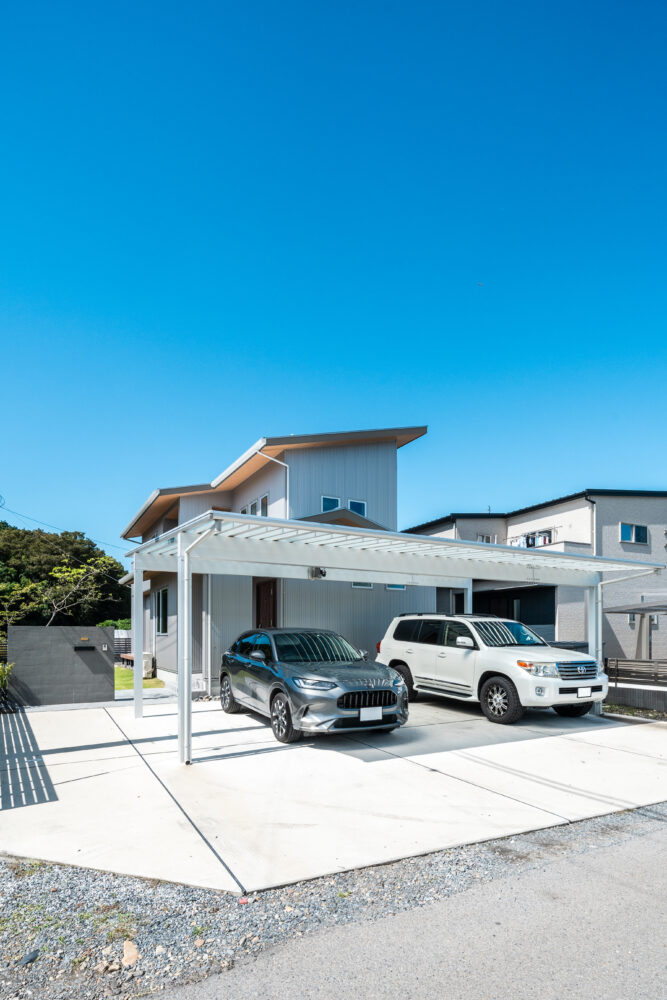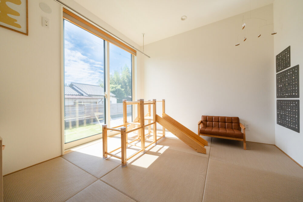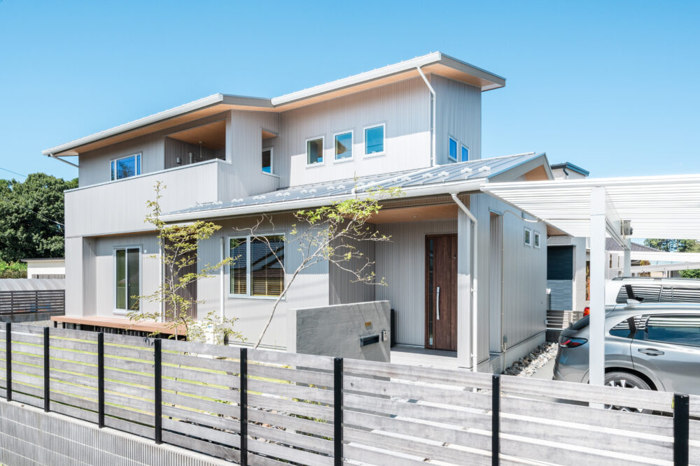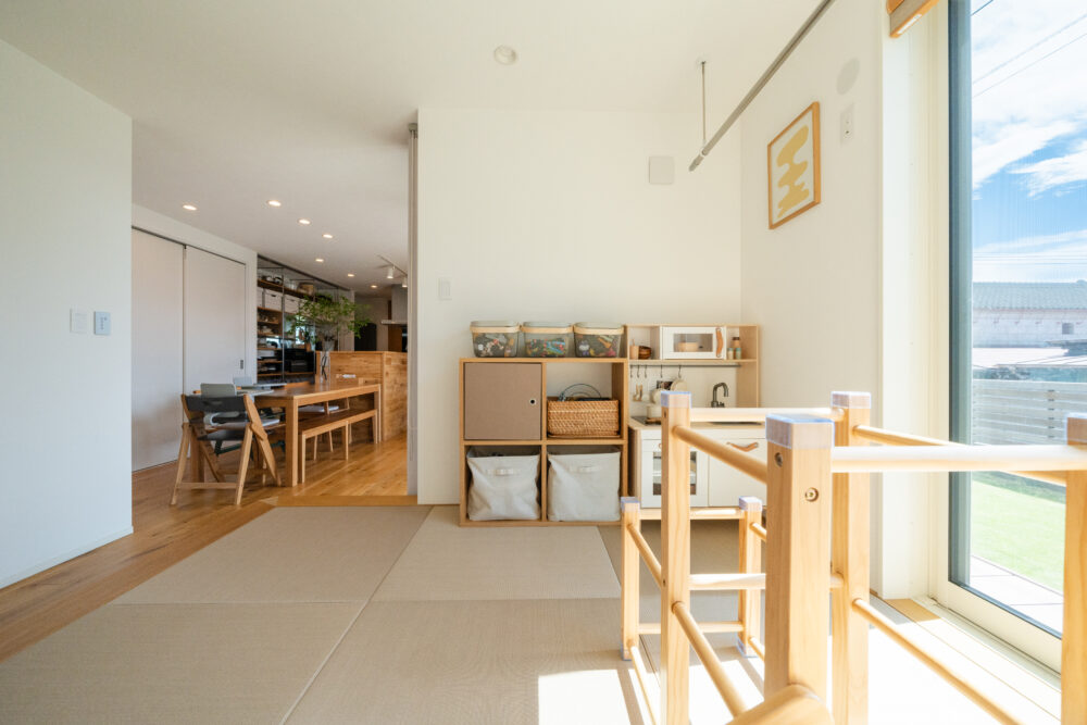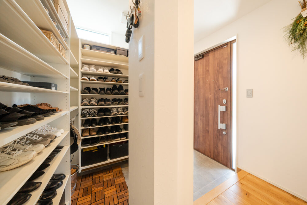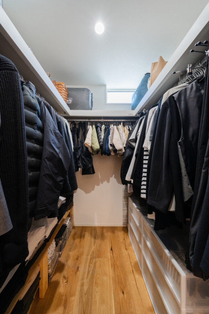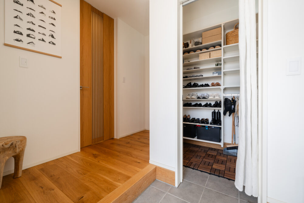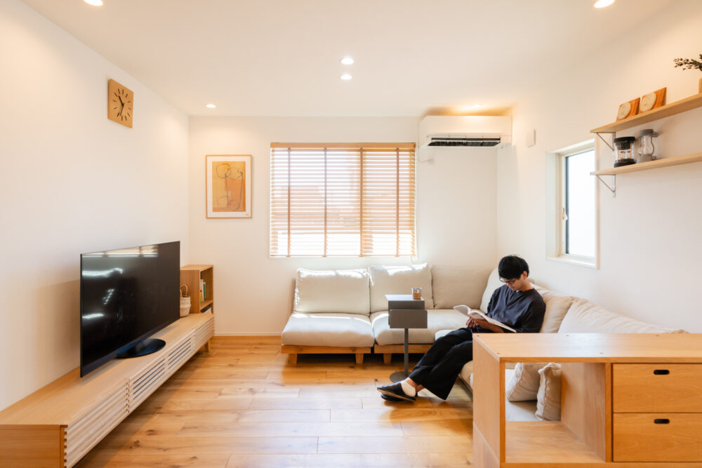 床や建具、キッチン、家具まで、オーク × ステンレスでテイストをそろえ統一感を持たせた内装デザイン。キッチンの背面収納は、あえてカップボードではなくユニットシェルフを採用することで「キッチンっぽさ」を出さず、家具のような、飾り棚のような雰囲気にしたところがこだわりポイントです。