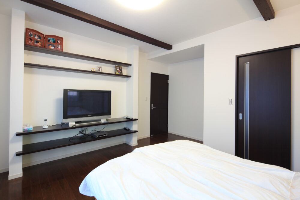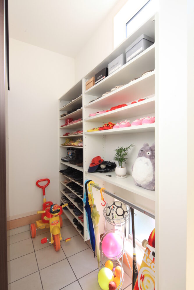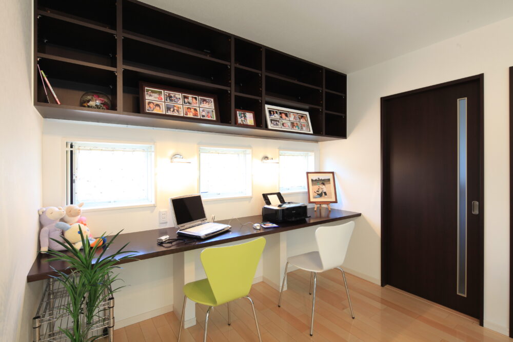 とにかくゆったりしたリビングで家族団らんを過ごしたい。そんな思いでつくられたこの一邸。上部には2階のホールとつながる吹き抜けを設け、南側の大きな窓を開け放つとつながるウッドデッキスペース。晴れた休日は中と外を目いっぱい使った憩いの一時を。