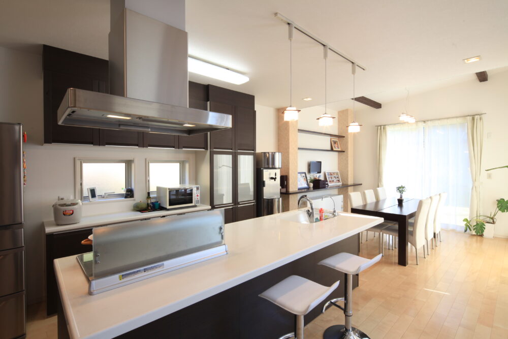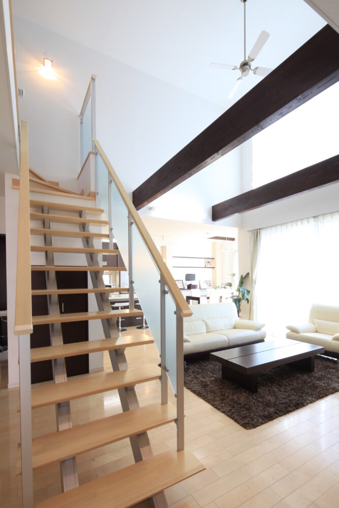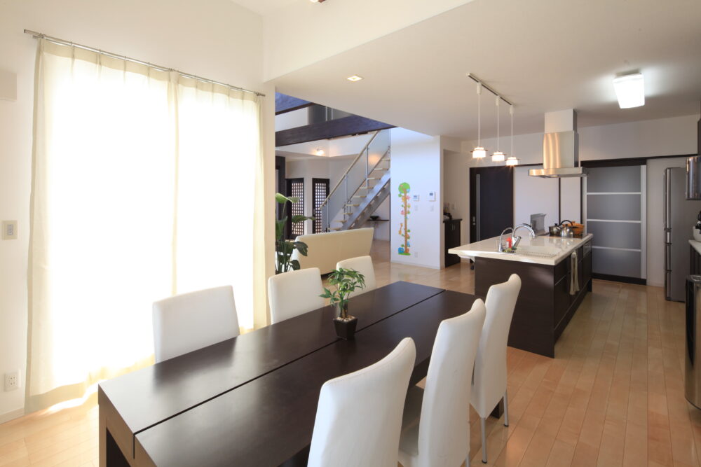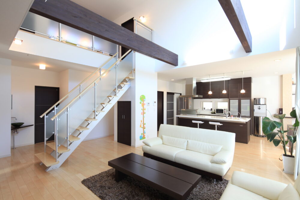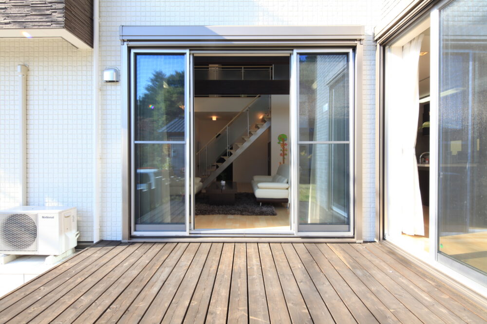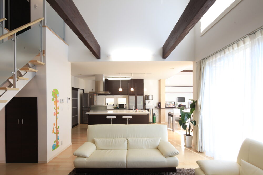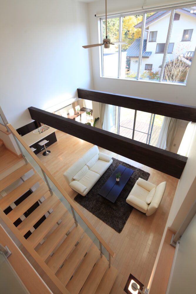 吹き抜けとウッドデッキがつながるLDKで、家族団欒の家。