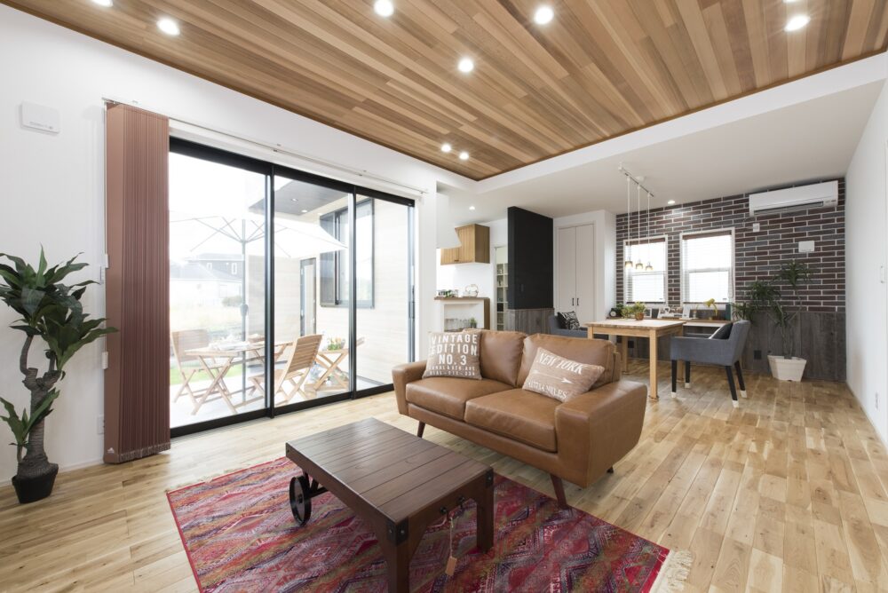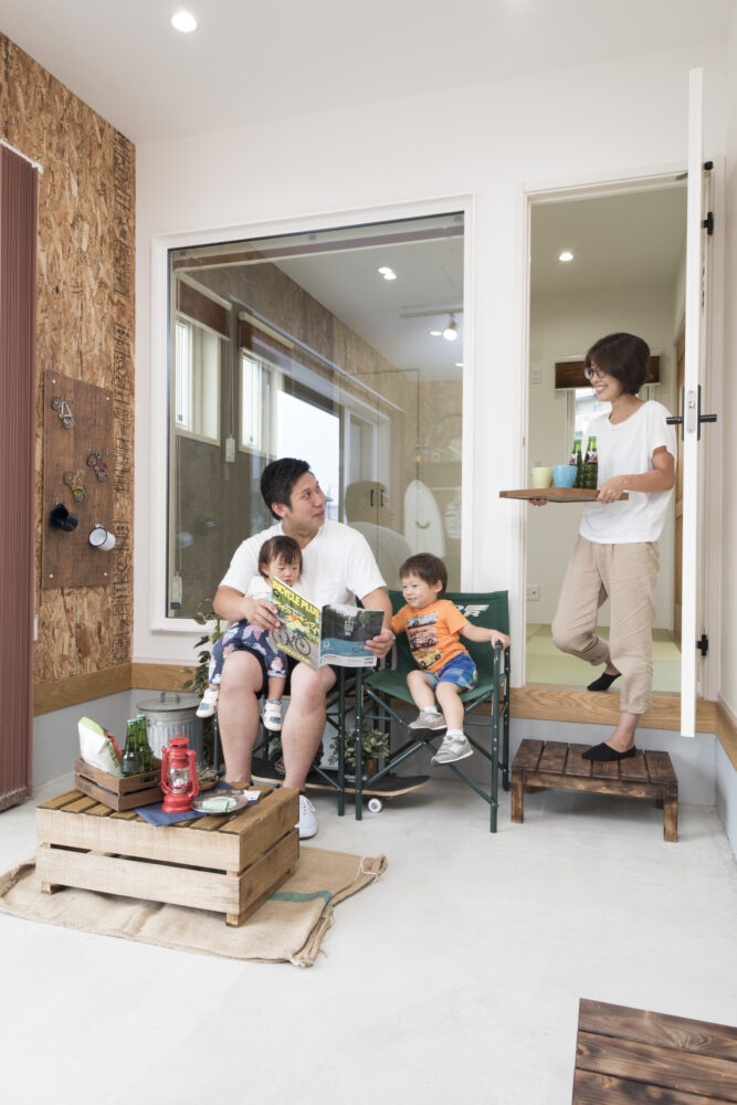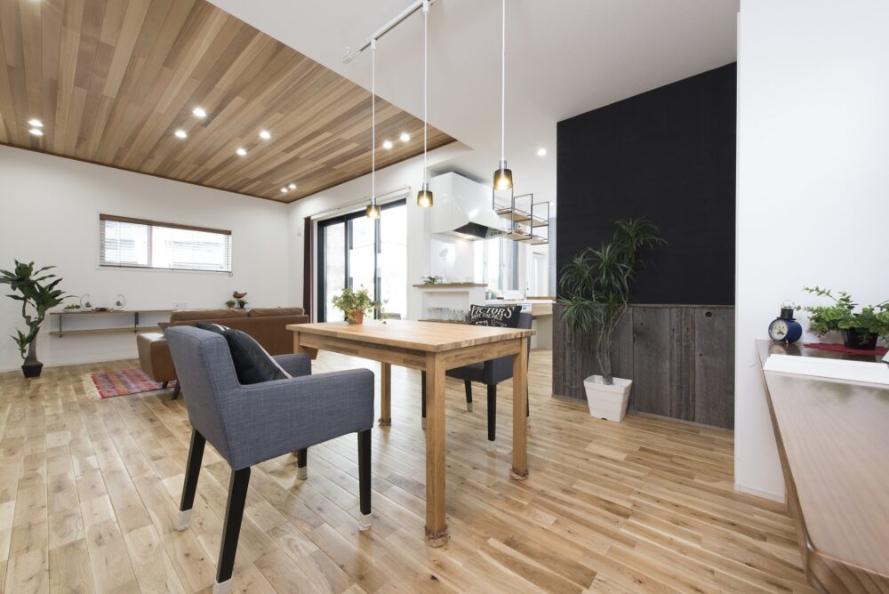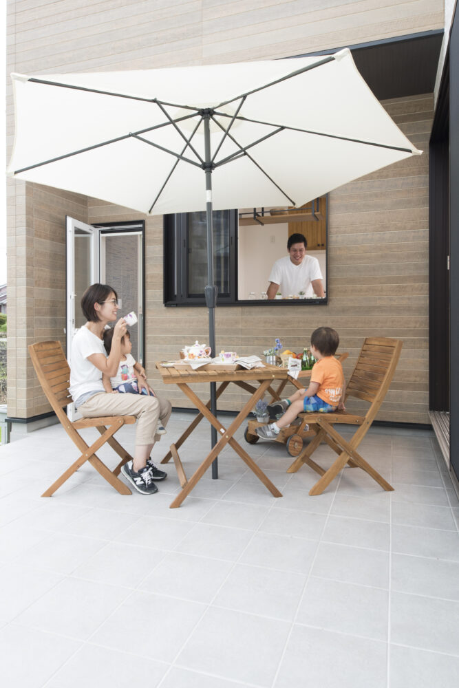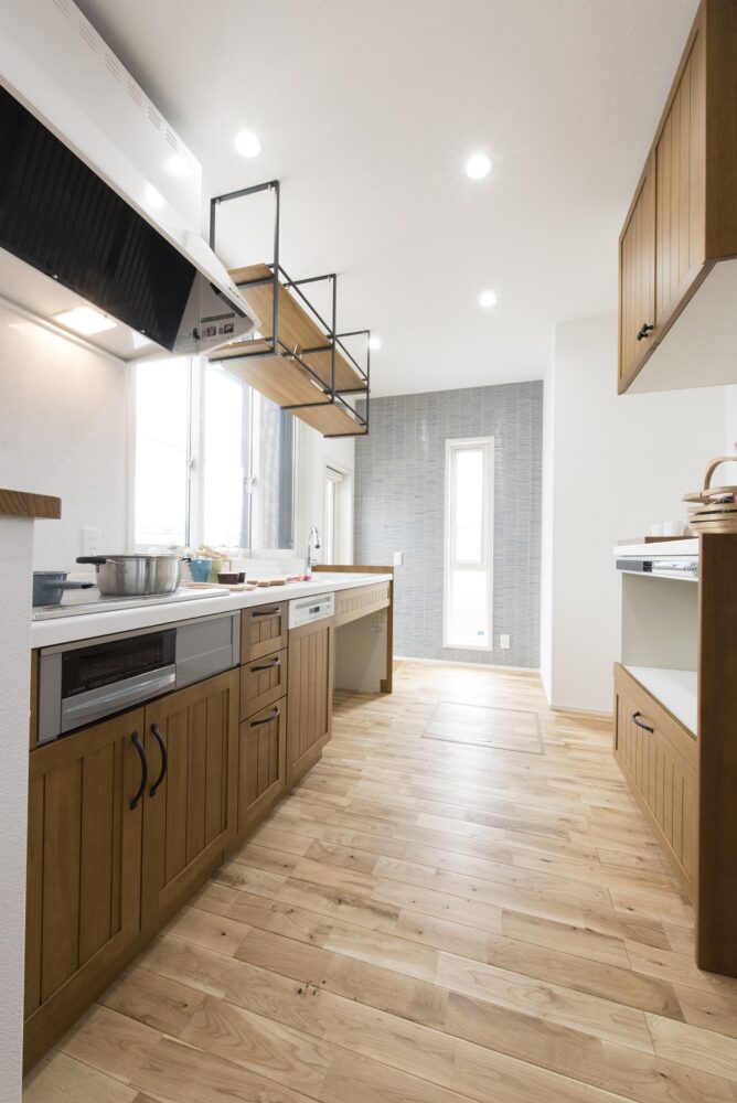 インダストリアルスタイルを要所に取り入れ、家族が楽しく暮らせる工夫もたくさん盛り込んだ住まい。キッチンは南に面し、外の景色を見ながらお料理ができます。奥の勝手口は南面のカフェテラスにつながっているので、お茶やお菓子の準備をしてカフェテラスでのんびりと過ごすのもいいですね。