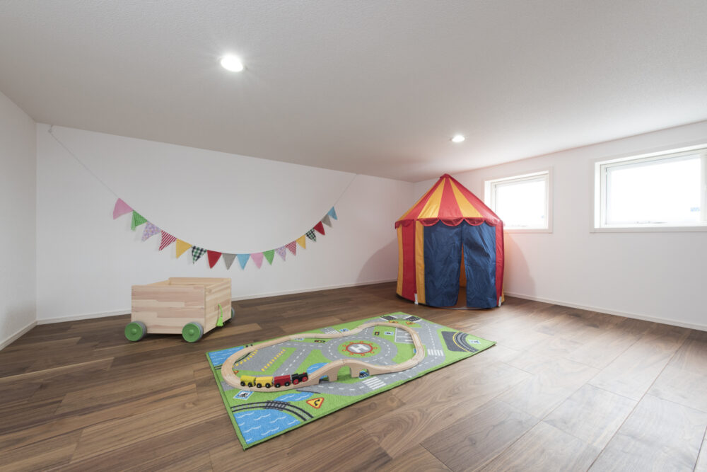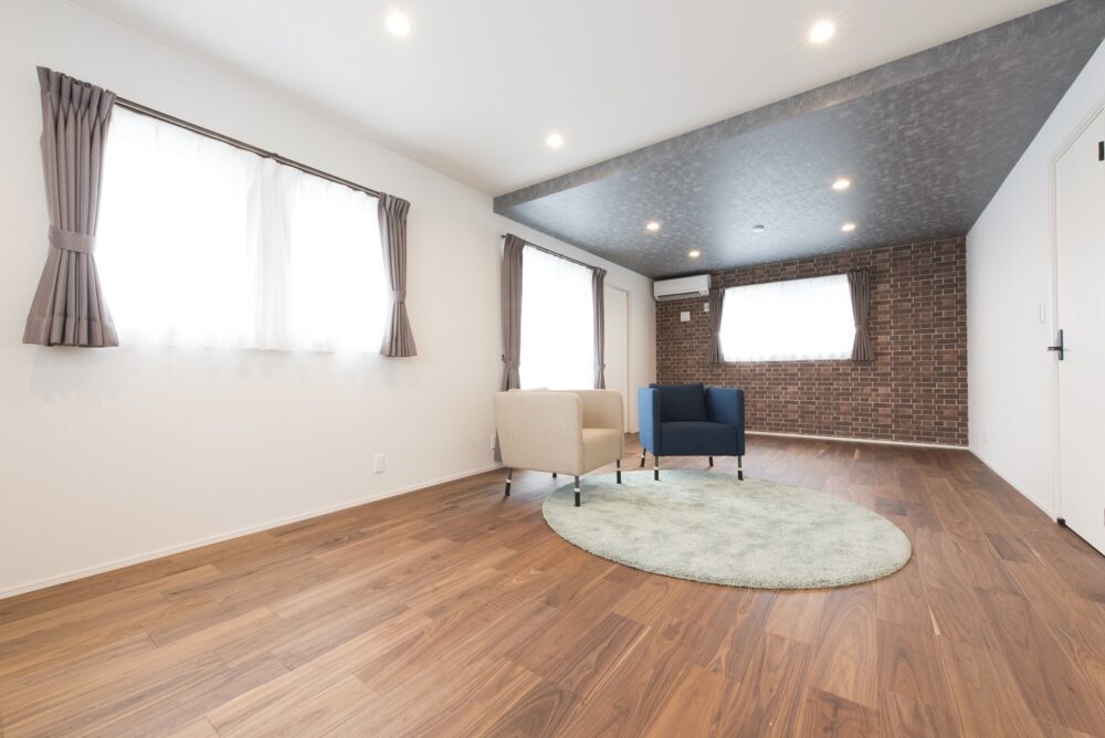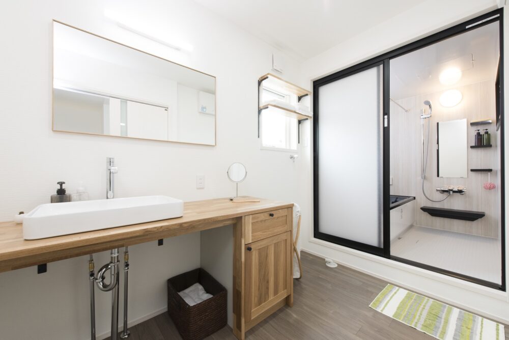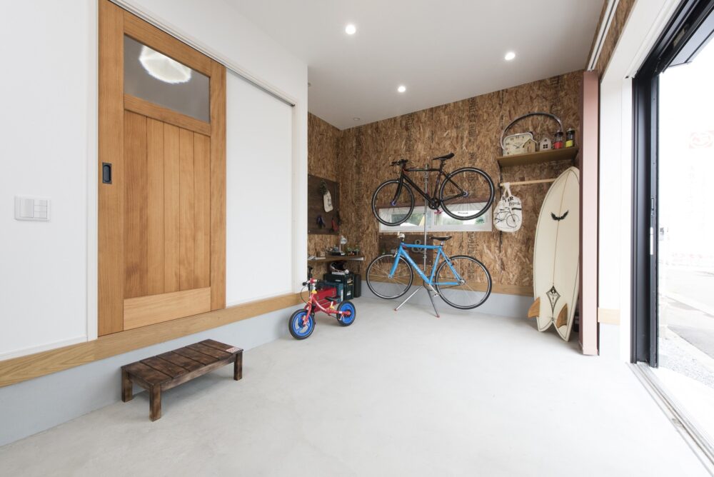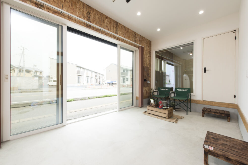 インダストリアルスタイルを要所に取り入れ、家族が楽しく暮らせる工夫もたくさん盛り込んだ住まい。キッチンは南に面し、外の景色を見ながらお料理ができます。奥の勝手口は南面のカフェテラスにつながっているので、お茶やお菓子の準備をしてカフェテラスでのんびりと過ごすのもいいですね。
