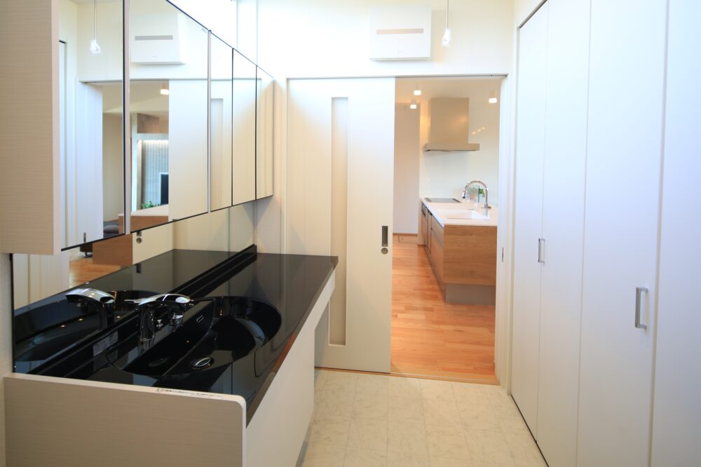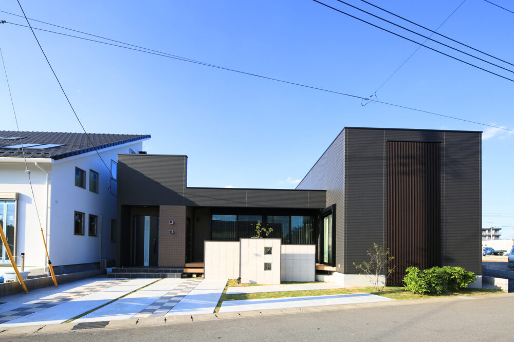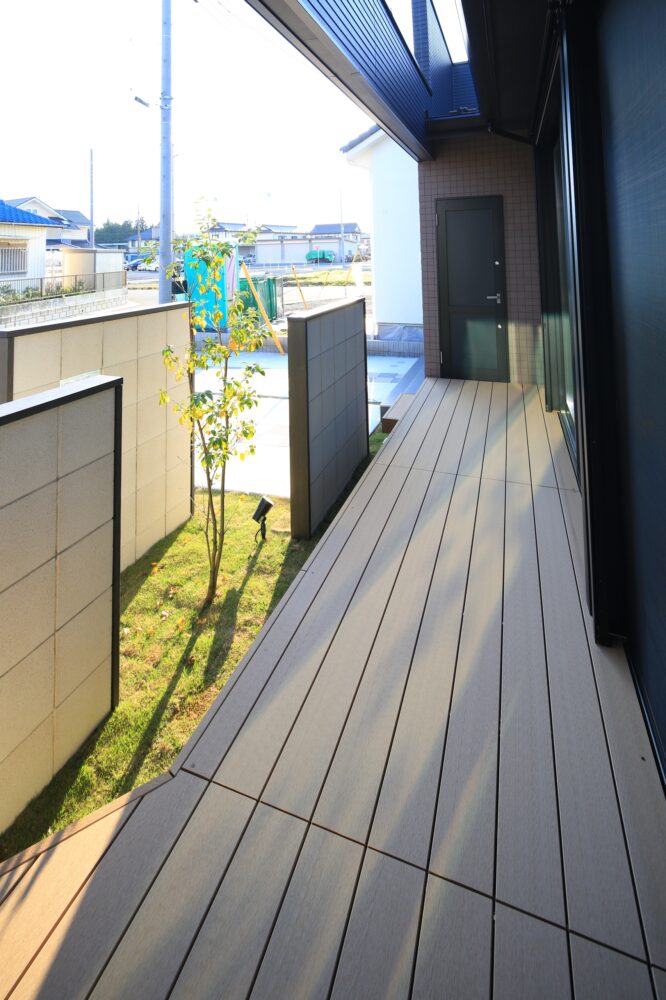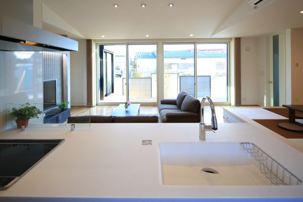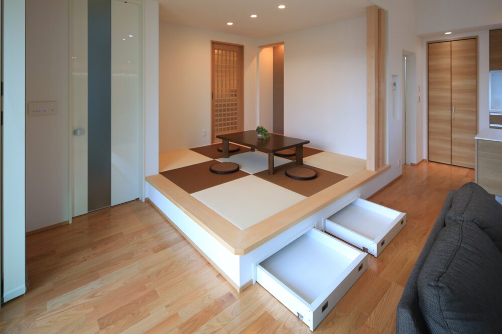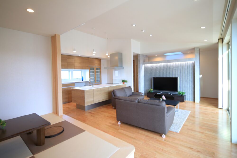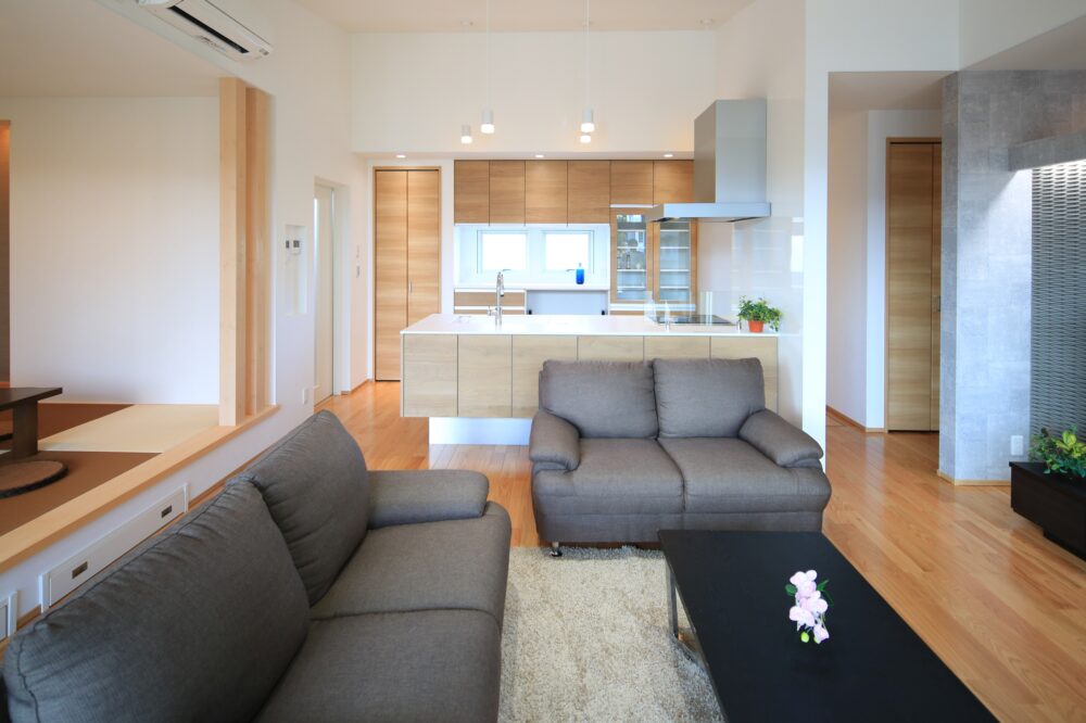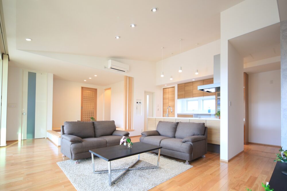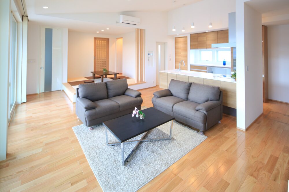 約20帖のリビングと畳スペースの融合。ウッドデッキがさらに暮らしやすさと開放感を実感させてくれます。リビングは優しい色合いの木目を基調にした落ち着く空間に。屋根勾配に合わせた勾配天井は空間をさらに大きく演出します。