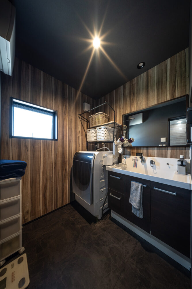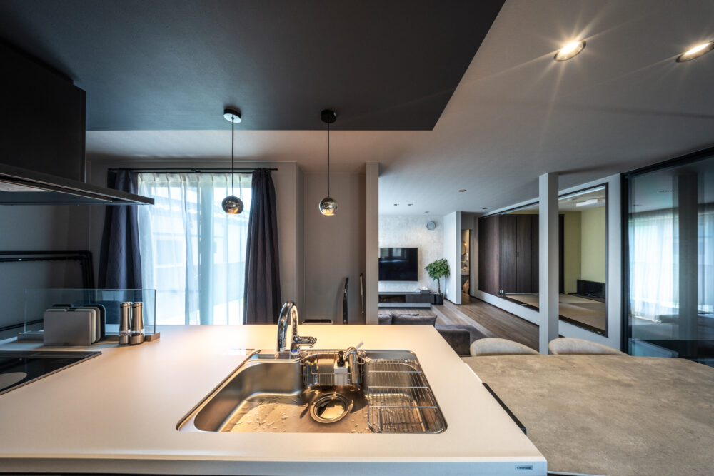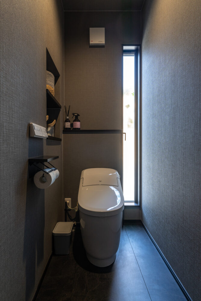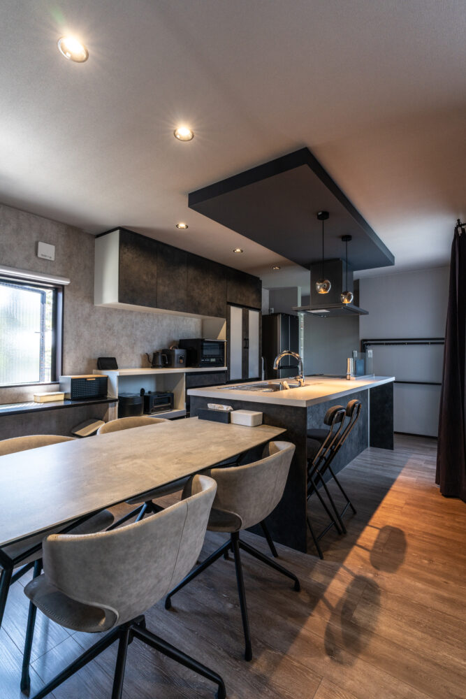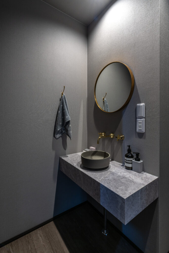 メインのクロスにライトグレーを採用。全体的にシックで落ち着いた空間に仕上がりました。アクセントとしてブラックや濃いブラウンも取り入れることでグッと引き締まり、ホテルライクな印象になっています。