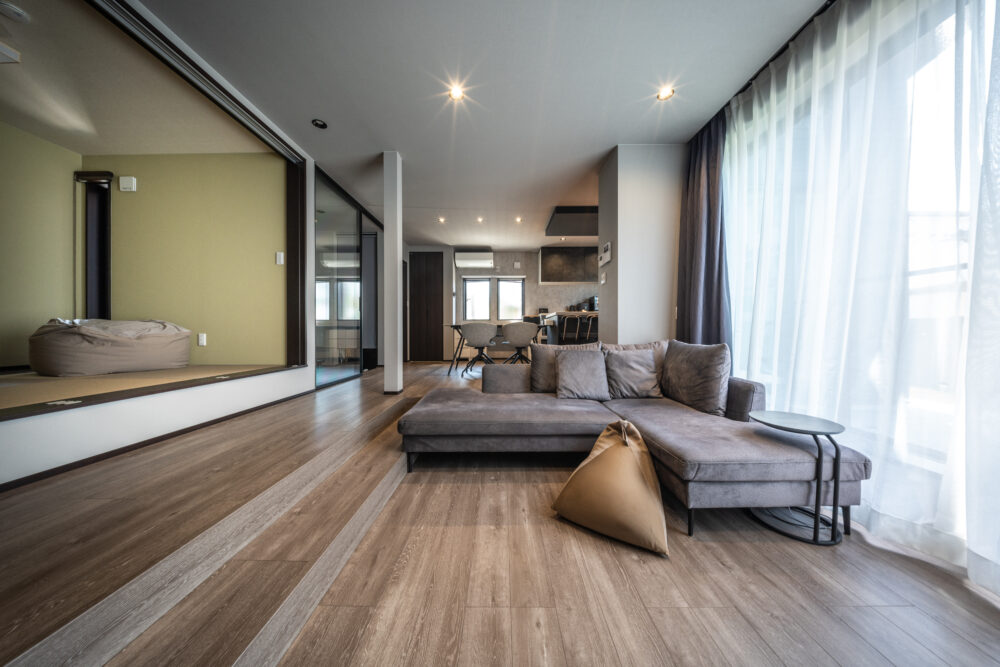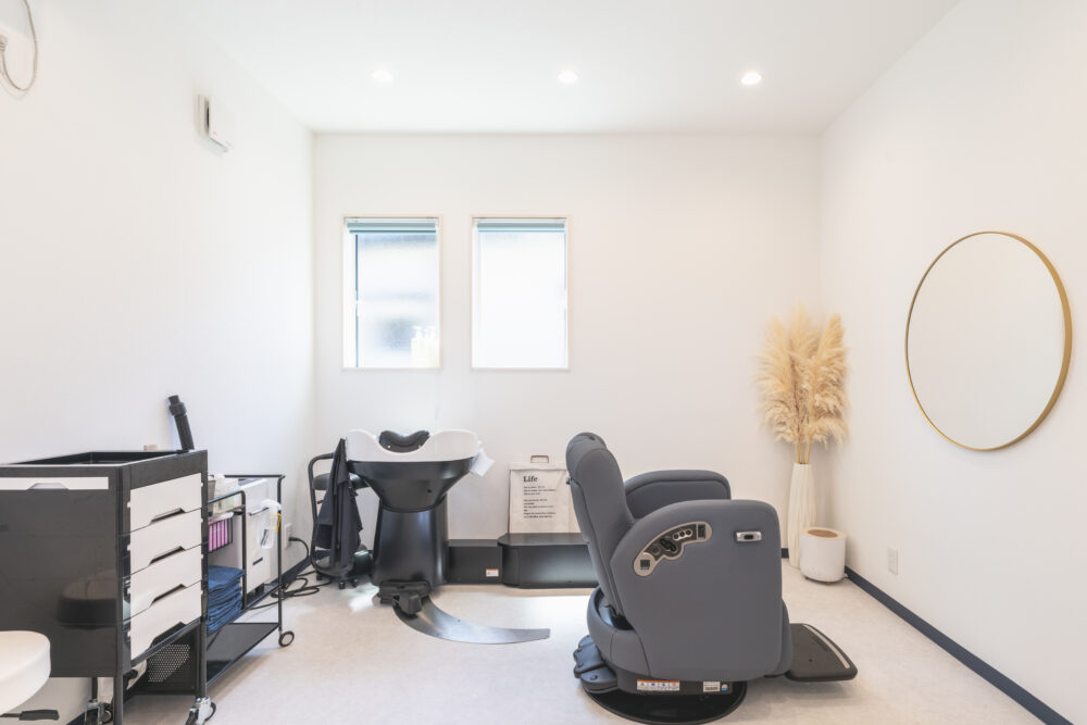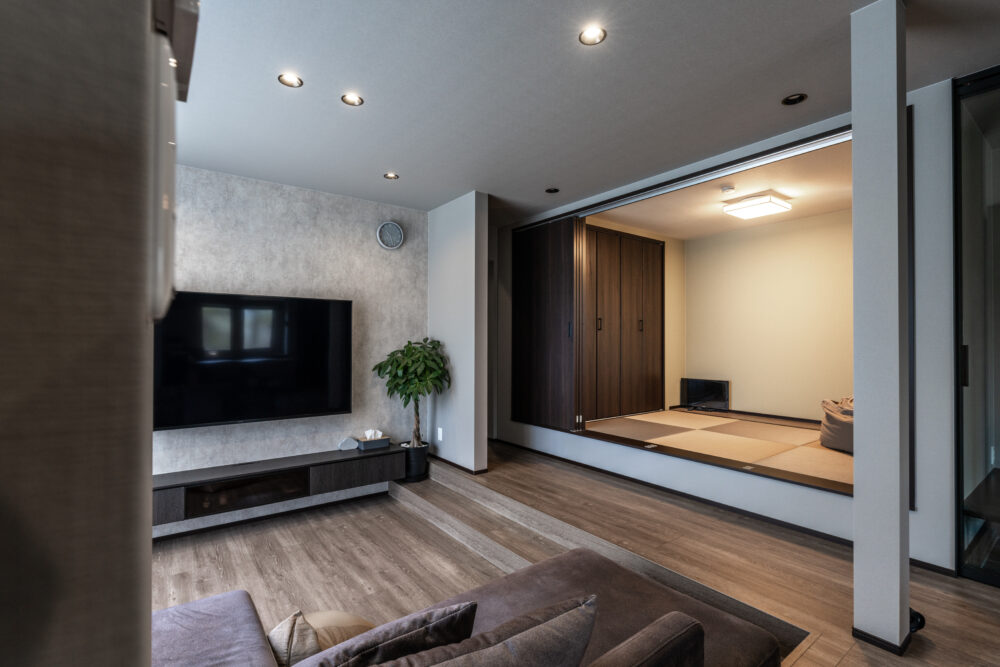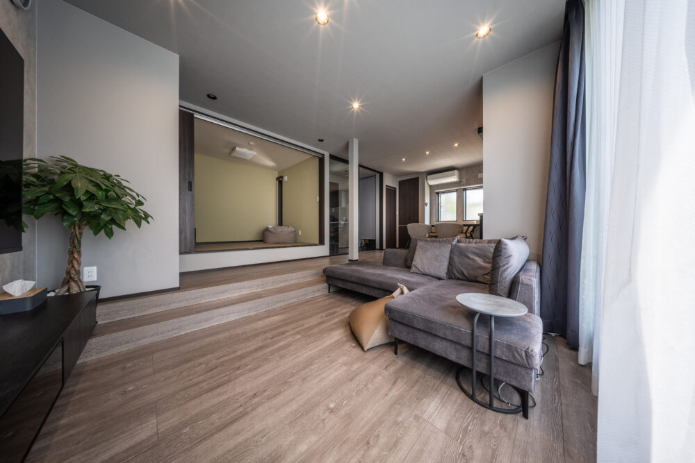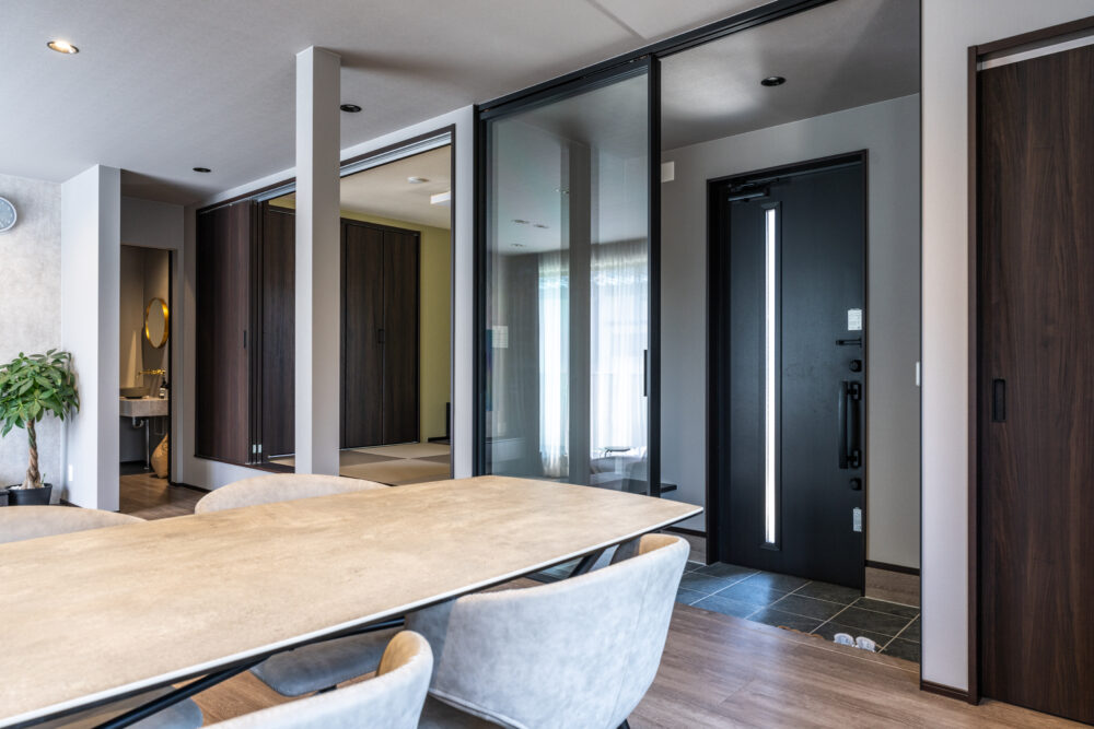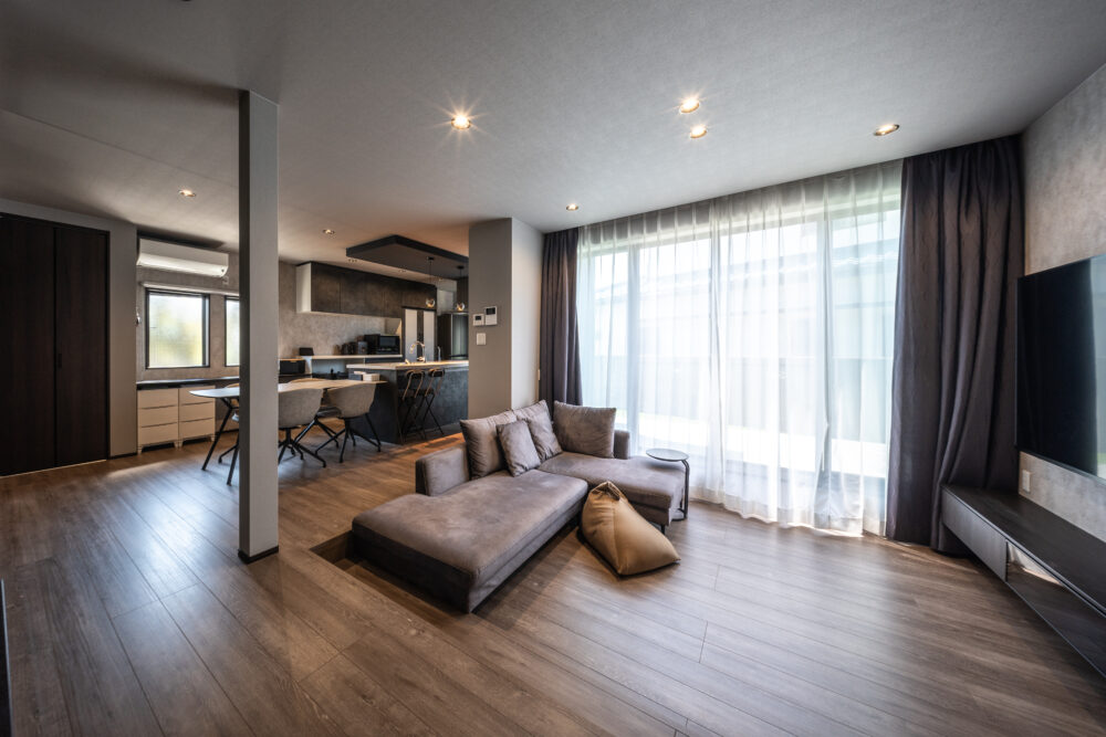 メインのクロスにライトグレーを採用。全体的にシックで落ち着いた空間に仕上がりました。アクセントとしてブラックや濃いブラウンも取り入れることでグッと引き締まり、ホテルライクな印象になっています。