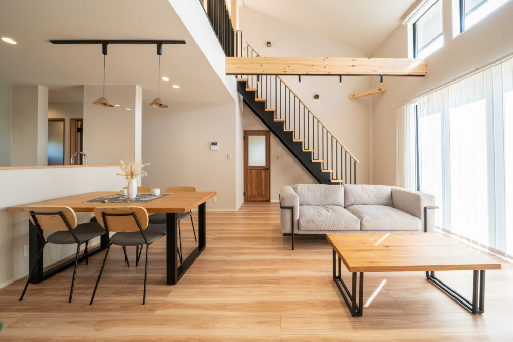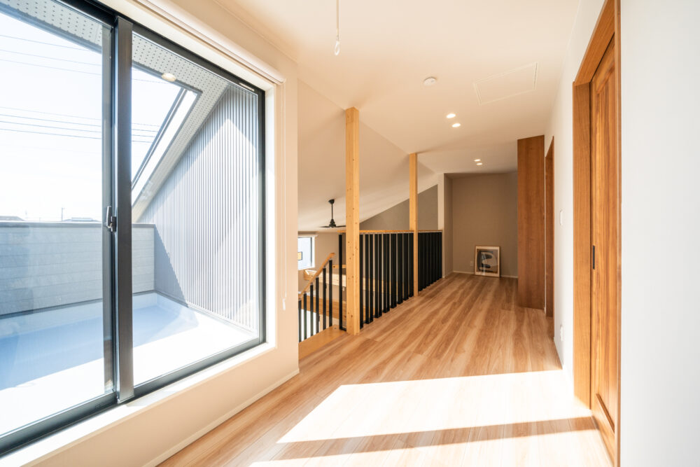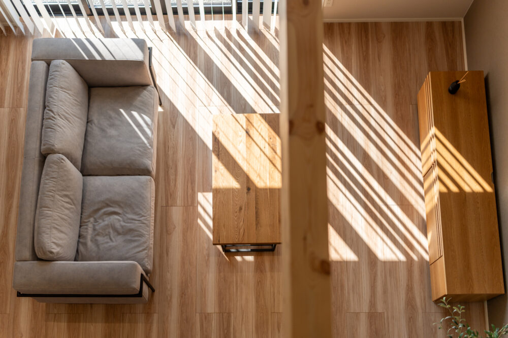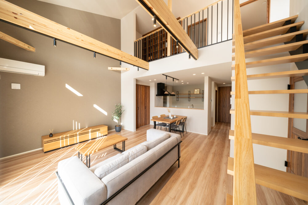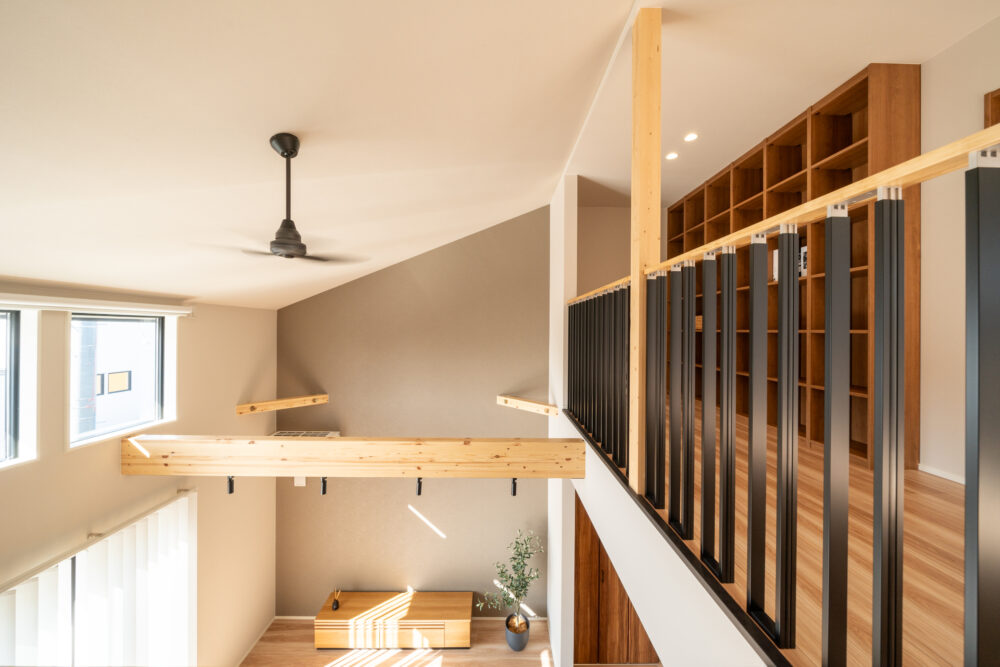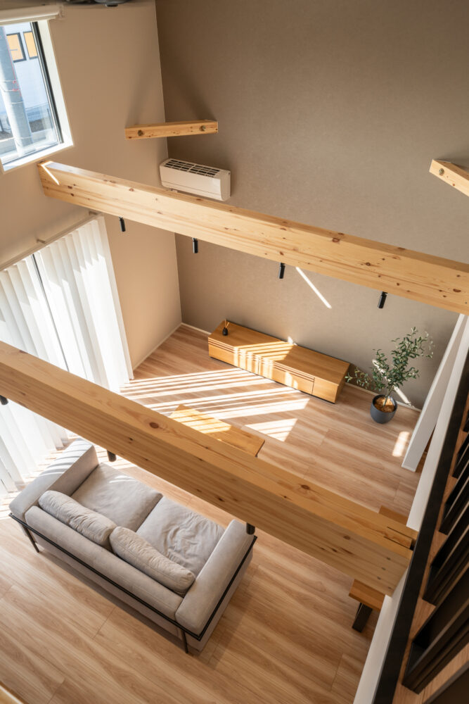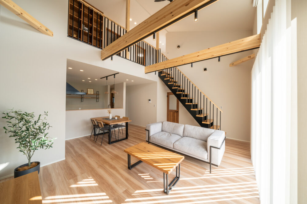 勾配天井の吹抜けで、開放感のあるリビング。2Fホールはフリースペースとしてあえて余白を残し、家族がつながる空間をつくりました。