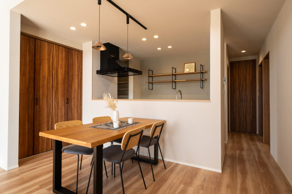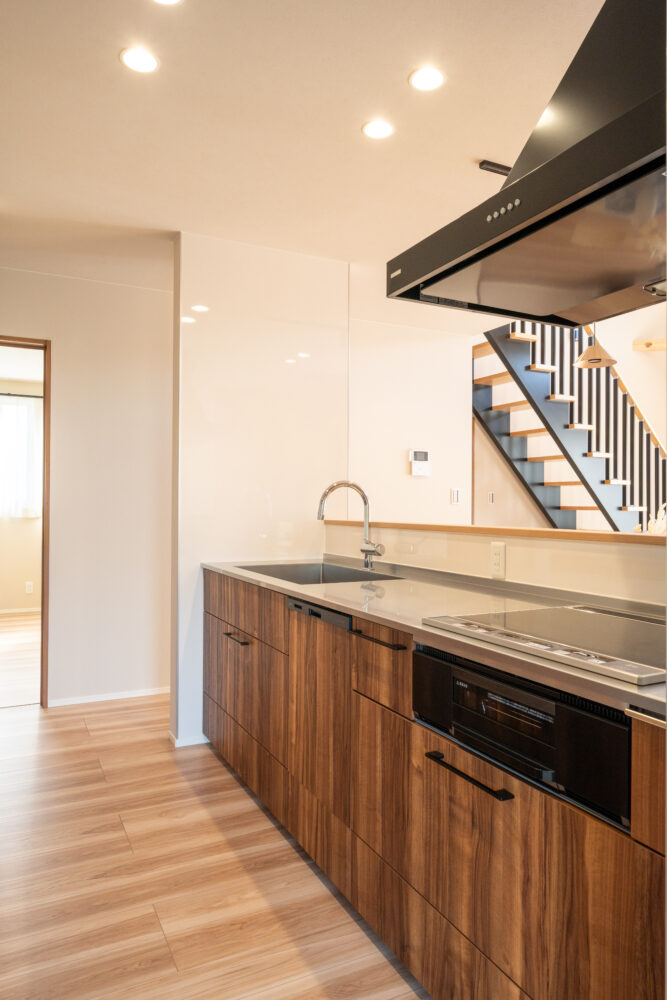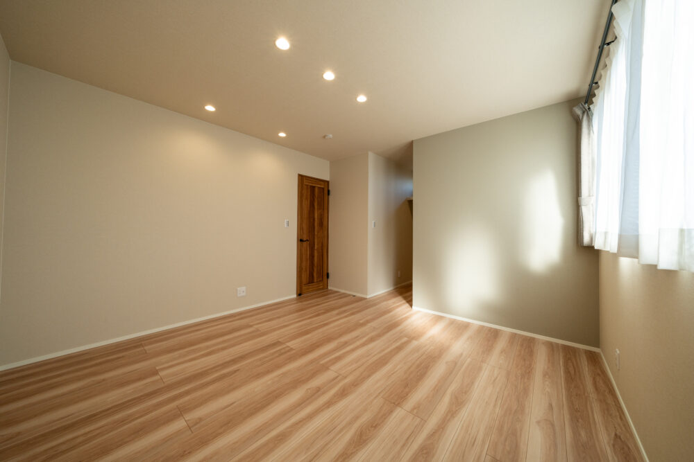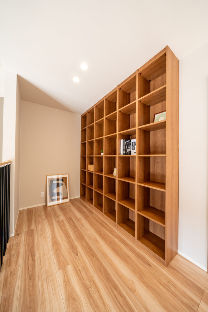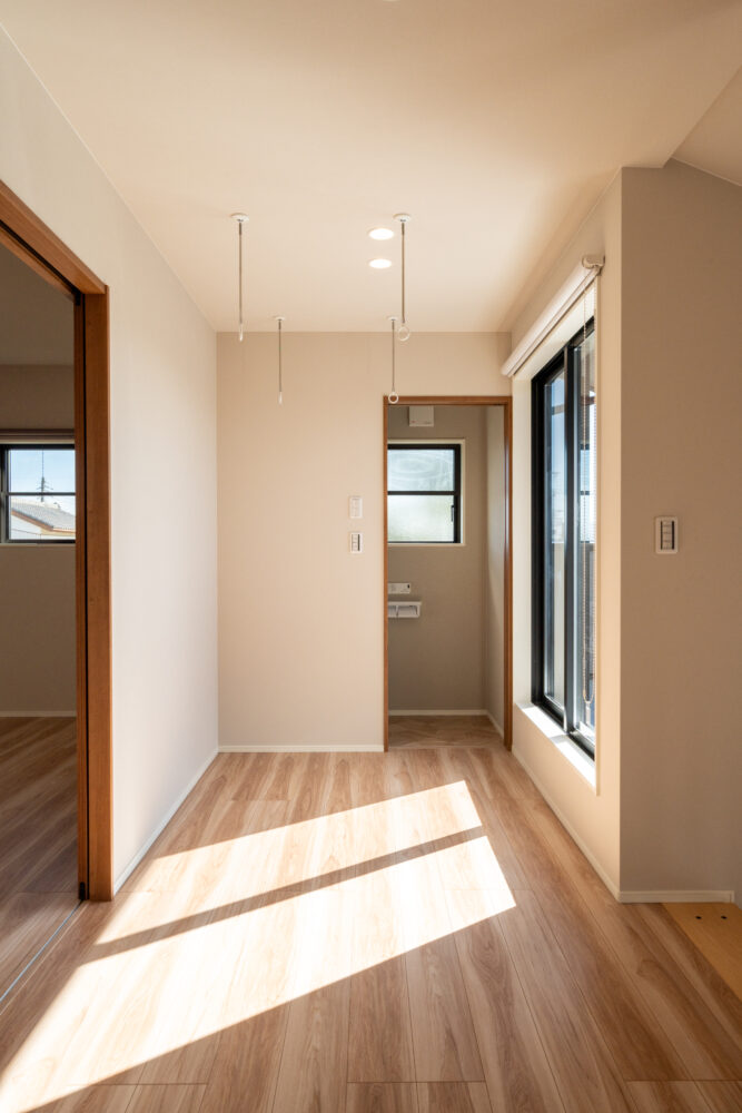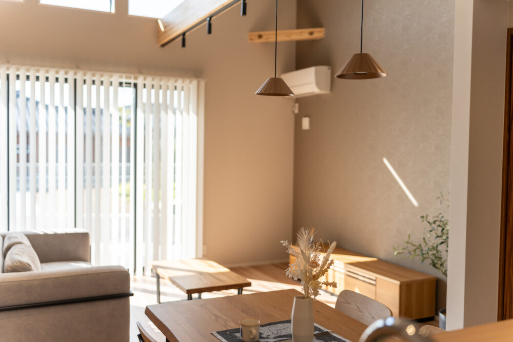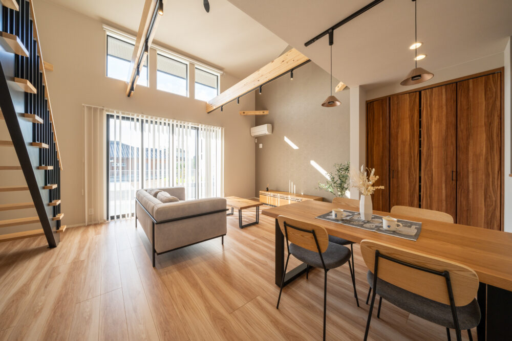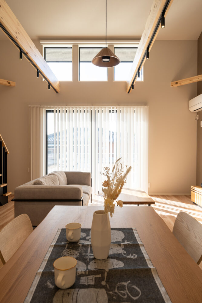 勾配天井の吹抜けで、開放感のあるリビング。2Fホールはフリースペースとしてあえて余白を残し、家族がつながる空間をつくりました。