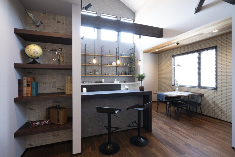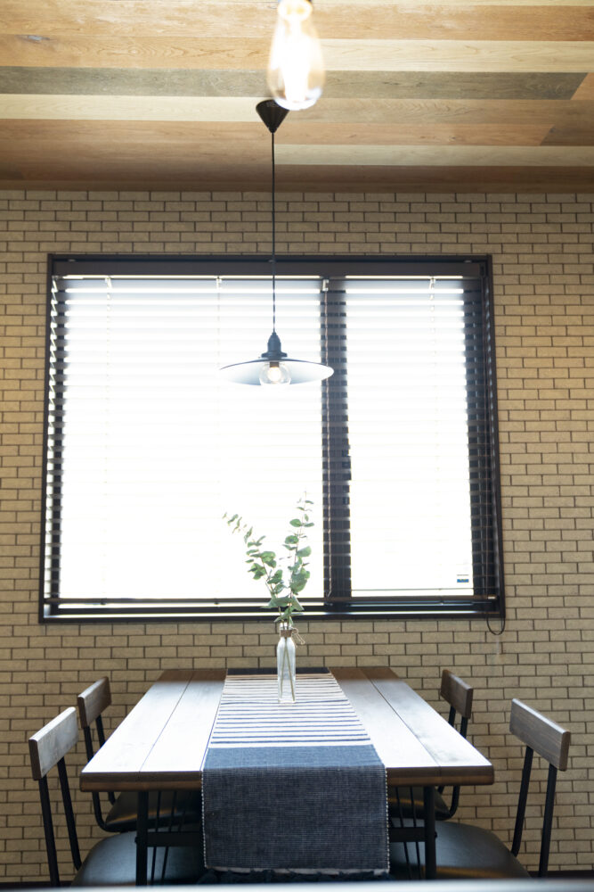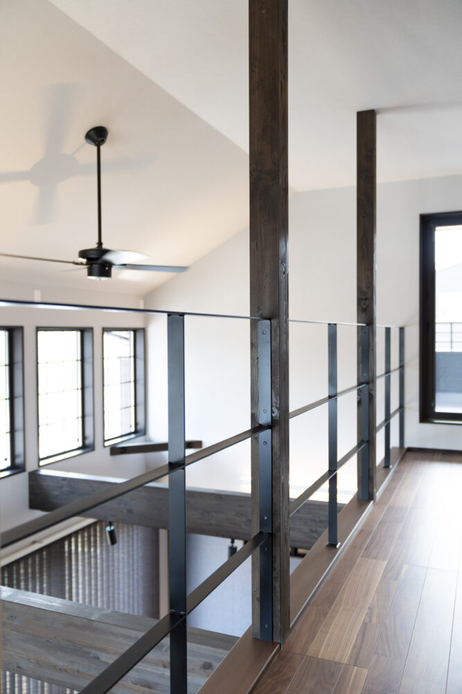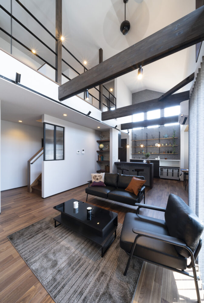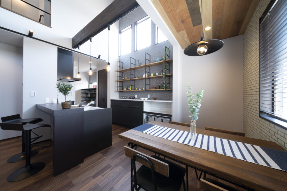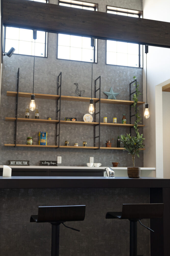 「男前なインダストリアルテイストの家」をテーマにデザイン。メインの壁紙には白ではなくグレーを採用し、武骨で無機質な質感のアイアンや、電球がむき出しのペンダントライト、格子窓なども相まってほどよいヴィンテージ感をつくります。全体的に落ち着いた色合いの内装ですが、LDKは吹抜けで窓も多く設けることで、明るさにもしっかりこだわりました。