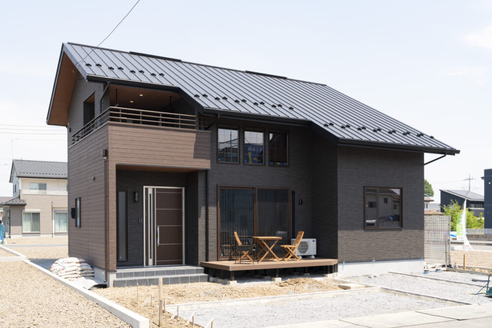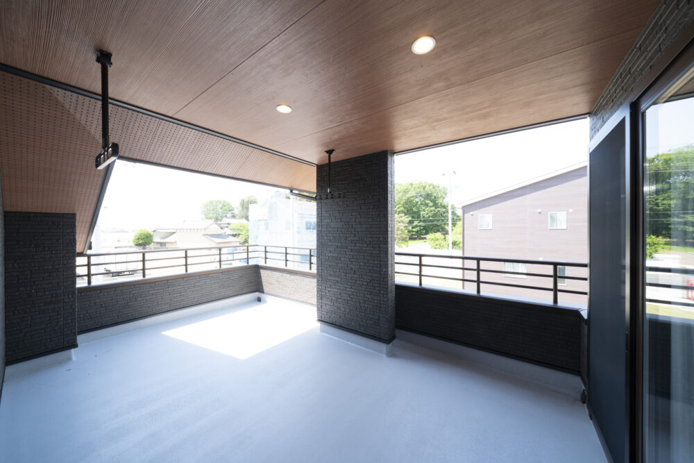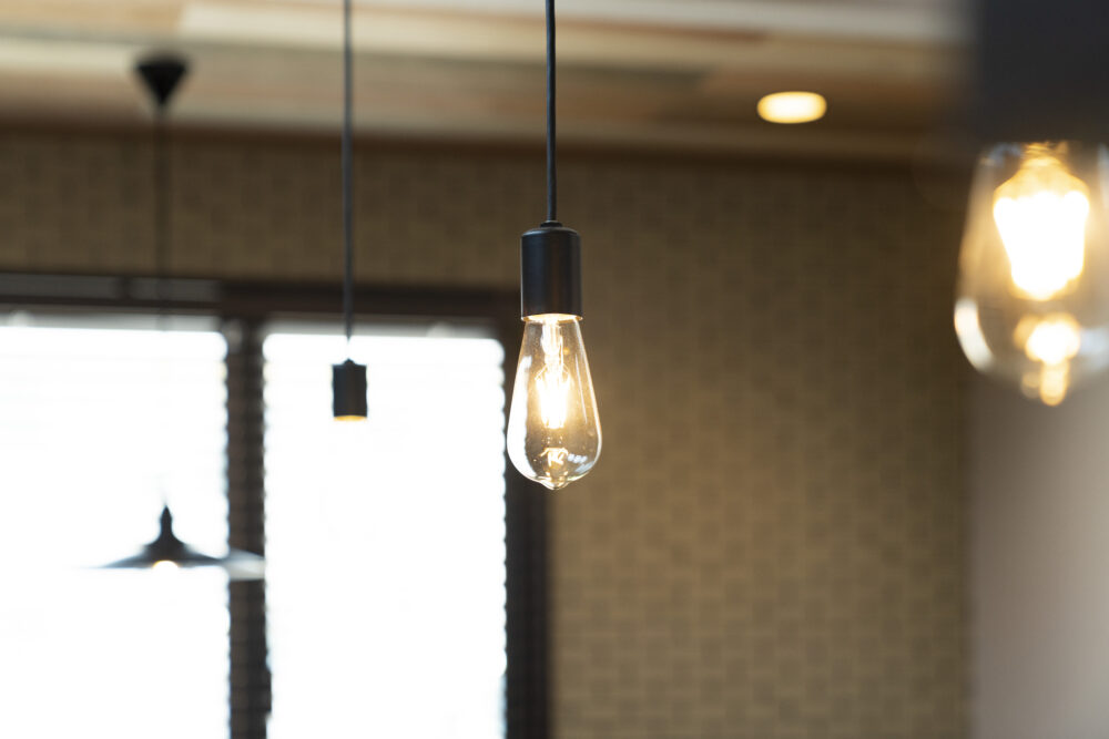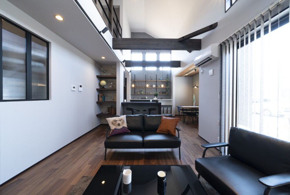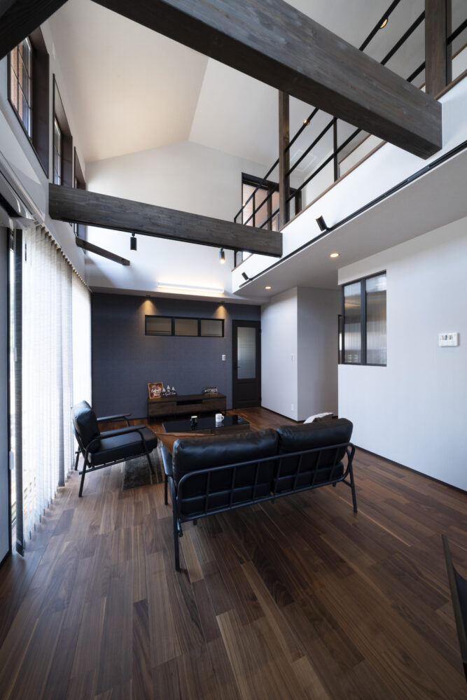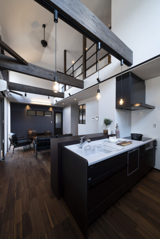 「男前なインダストリアルテイストの家」をテーマにデザイン。メインの壁紙には白ではなくグレーを採用し、武骨で無機質な質感のアイアンや、電球がむき出しのペンダントライト、格子窓なども相まってほどよいヴィンテージ感をつくります。全体的に落ち着いた色合いの内装ですが、LDKは吹抜けで窓も多く設けることで、明るさにもしっかりこだわりました。
