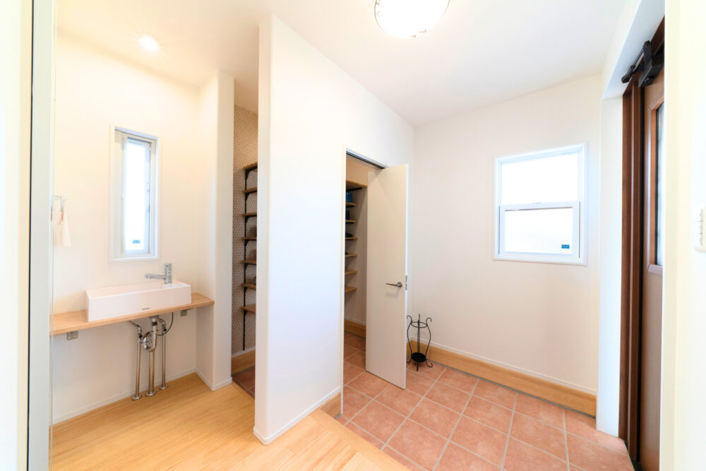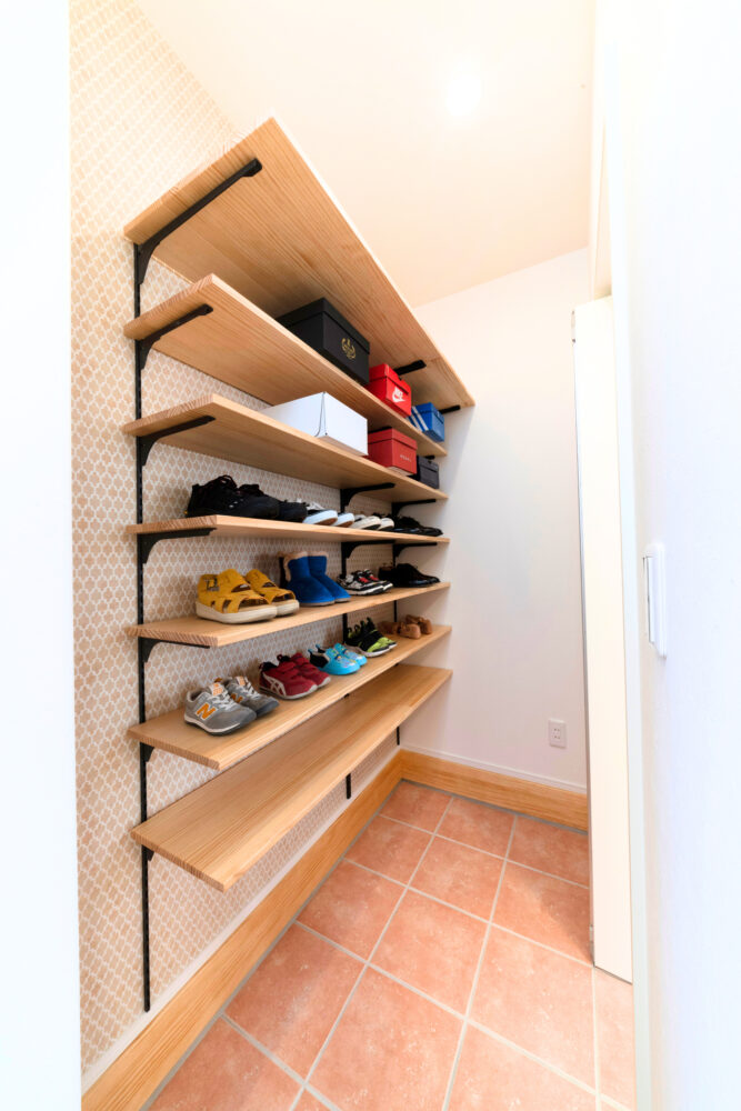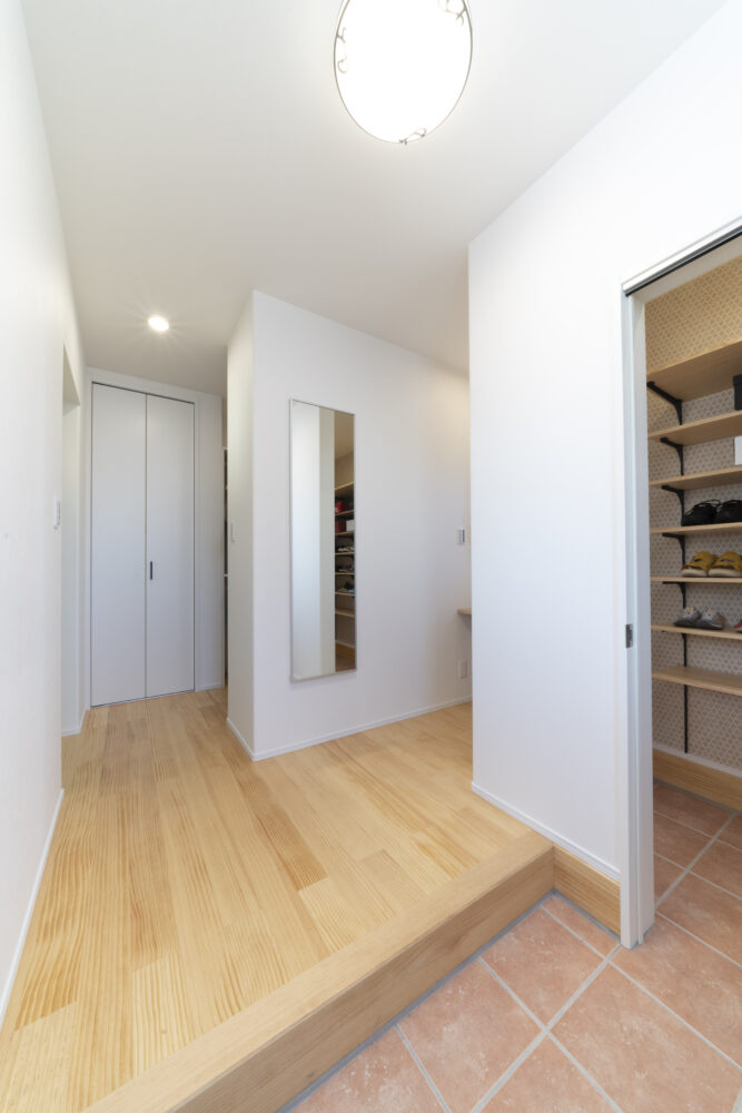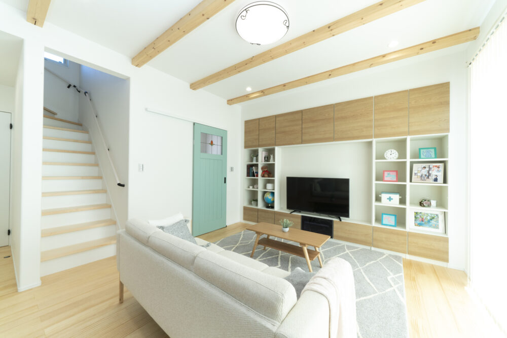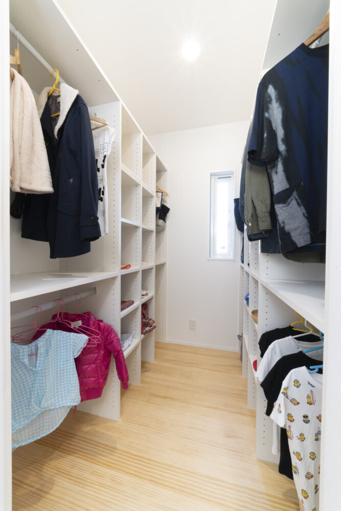 ママの家事が楽になるような動線を考えました。リビングは物が溢れて生活感が出ないよう壁一面を収納に。そして2階へとつながる階段がリビングにあることで、家族が帰ってきたときに自然とあいさつの習慣がつくような動線です。また、玄関ホールから出入りできるファミリークロークには、お出かけ時に必要な上着やバッグをしまっておけばバタバタしなくて済みます。