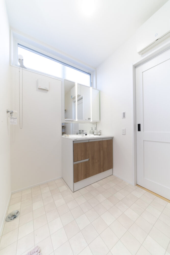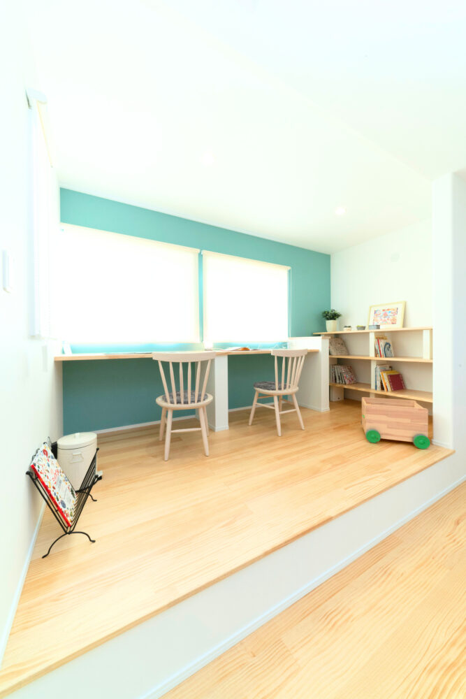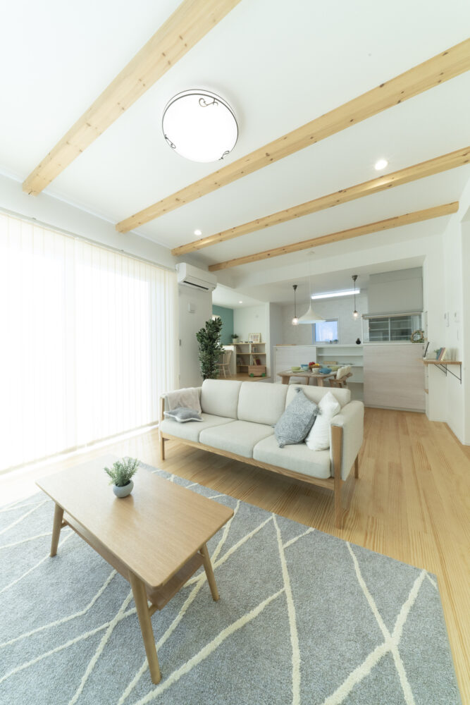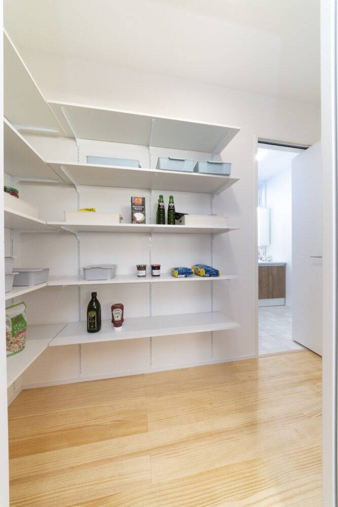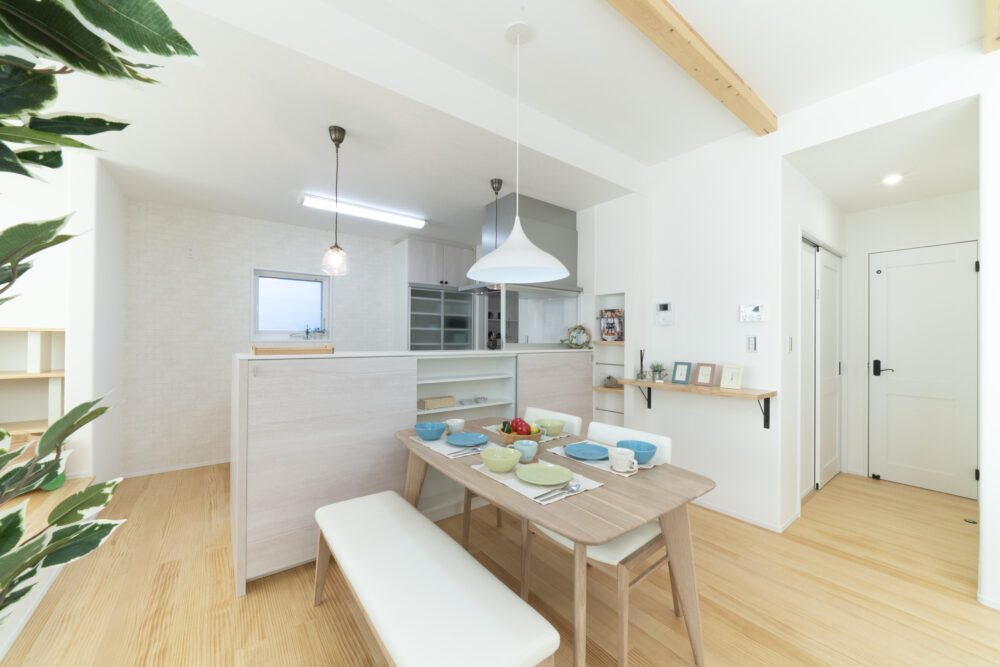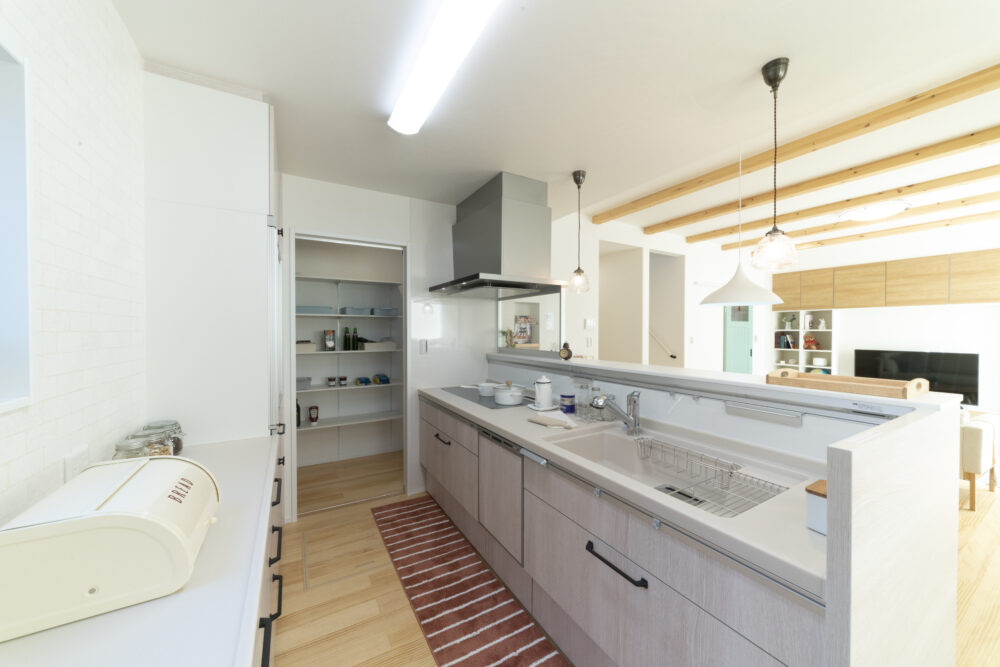 ママの家事が楽になるような動線を考えました。リビングは物が溢れて生活感が出ないよう壁一面を収納に。そして2階へとつながる階段がリビングにあることで、家族が帰ってきたときに自然とあいさつの習慣がつくような動線です。また、玄関ホールから出入りできるファミリークロークには、お出かけ時に必要な上着やバッグをしまっておけばバタバタしなくて済みます。
