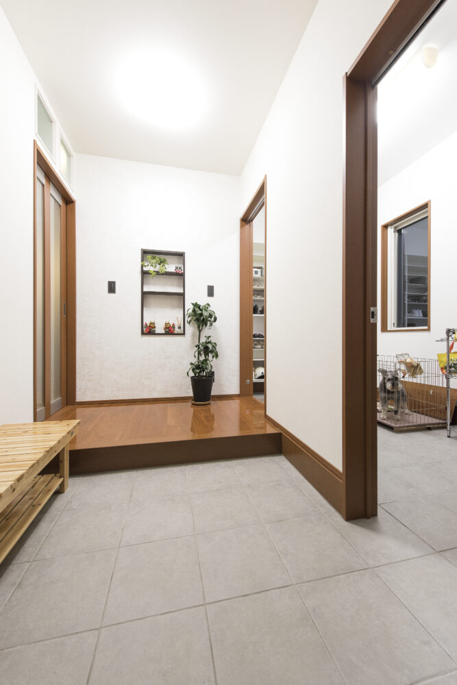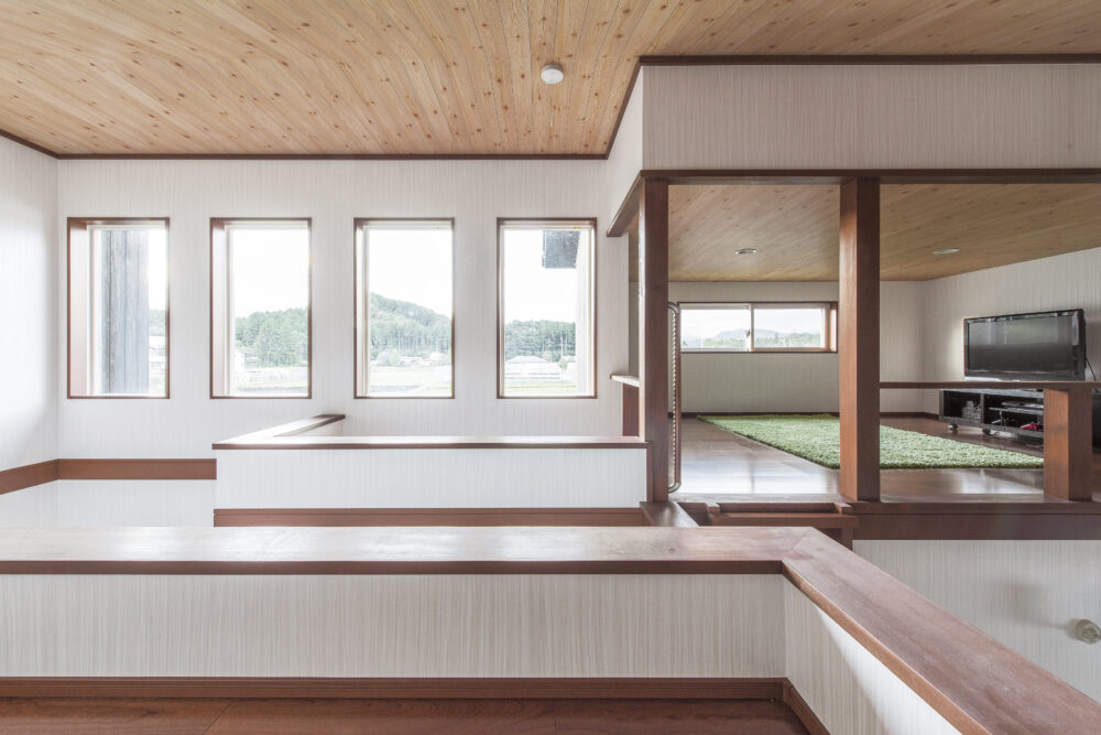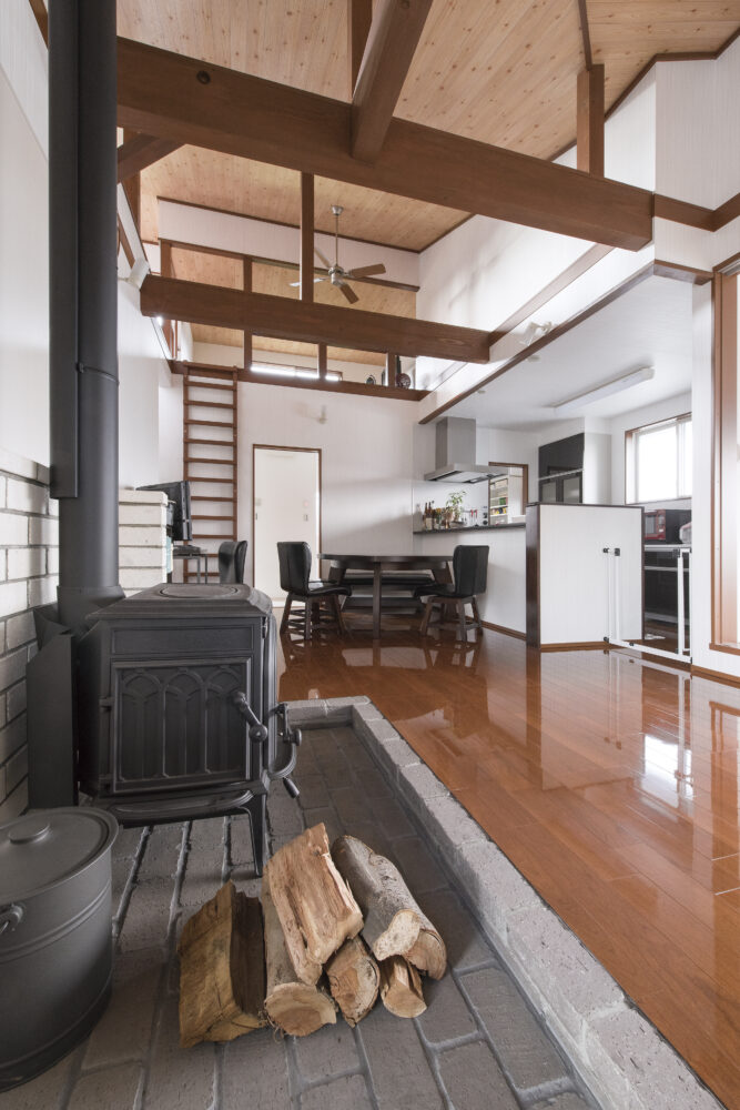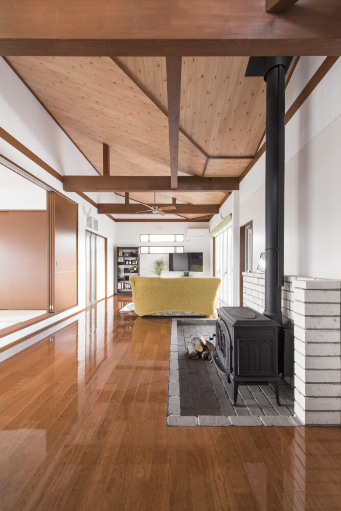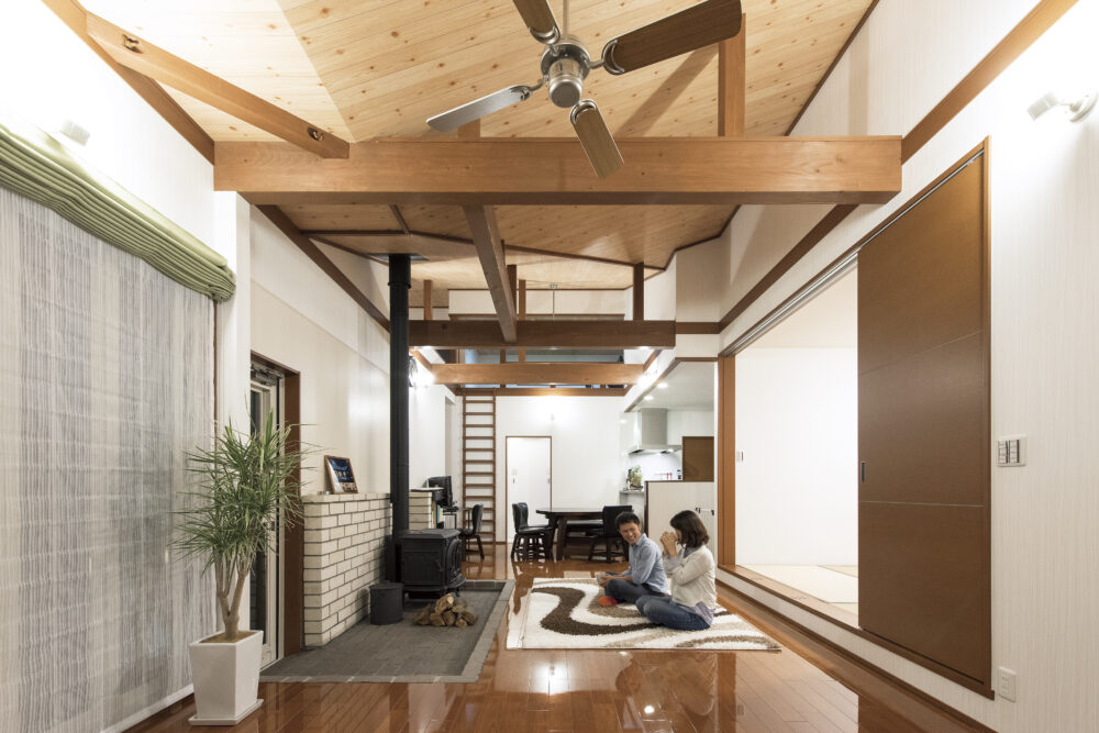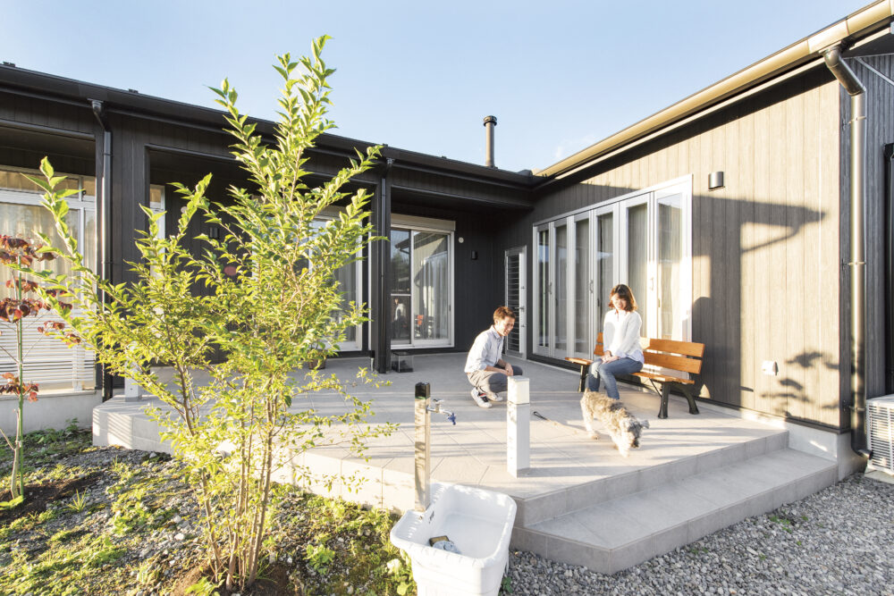 黒のガルバリウムを使用し、L字型のスタイリッシュな平屋に仕上げました。大きく設けたテラスでは四季の変化を感じられ、家族の憩いの場となっています。