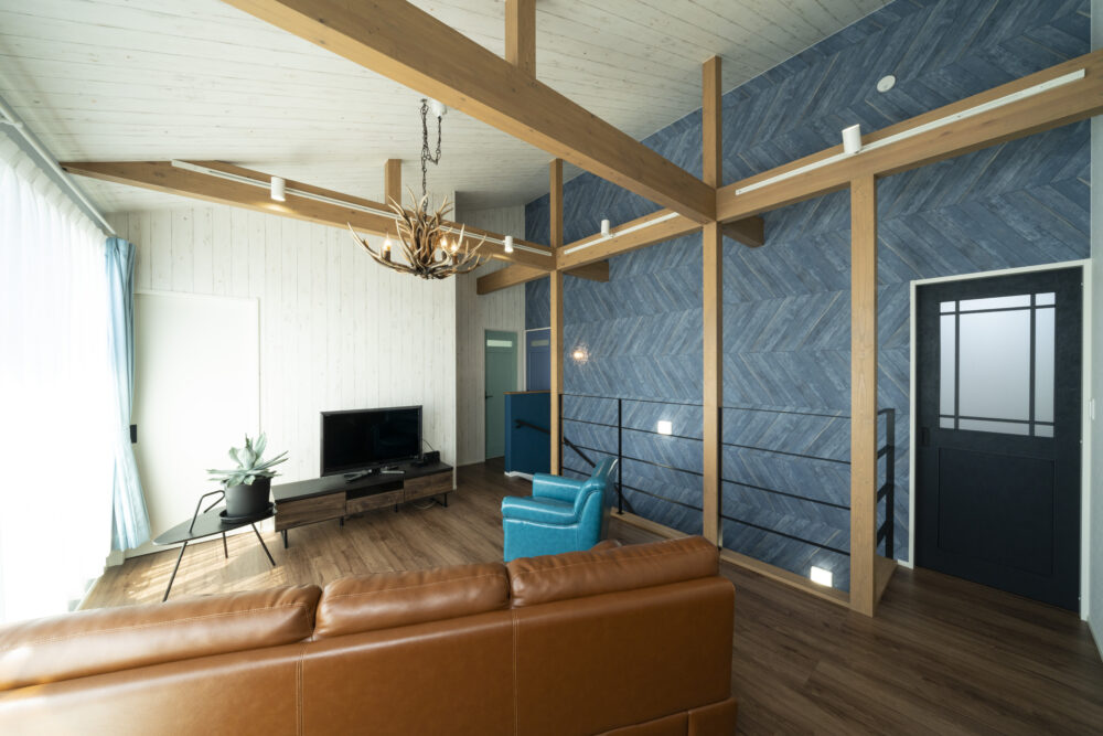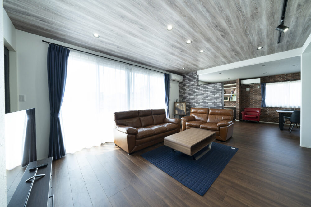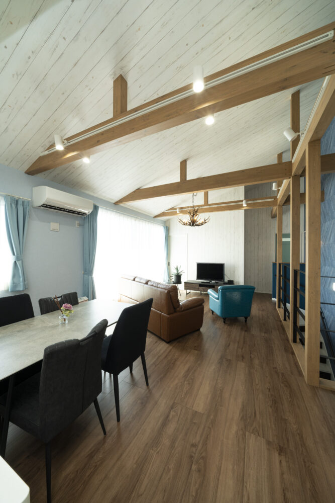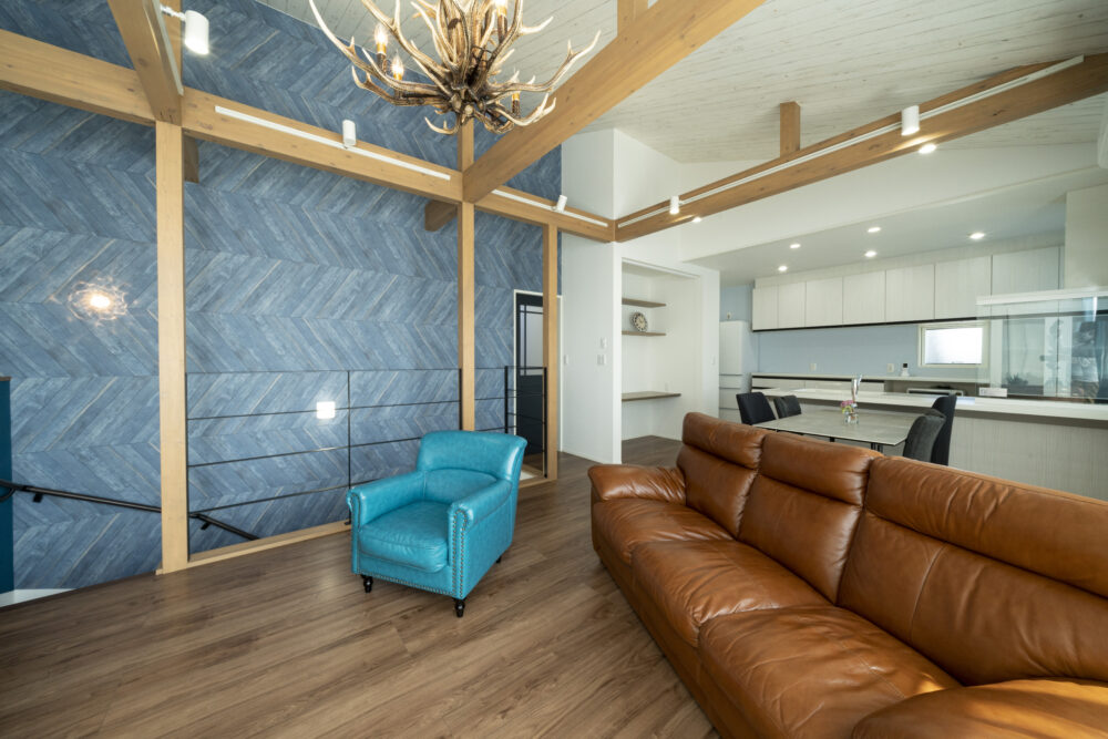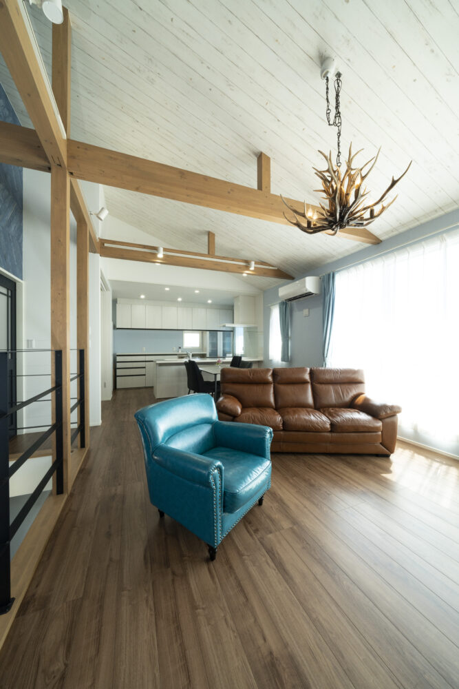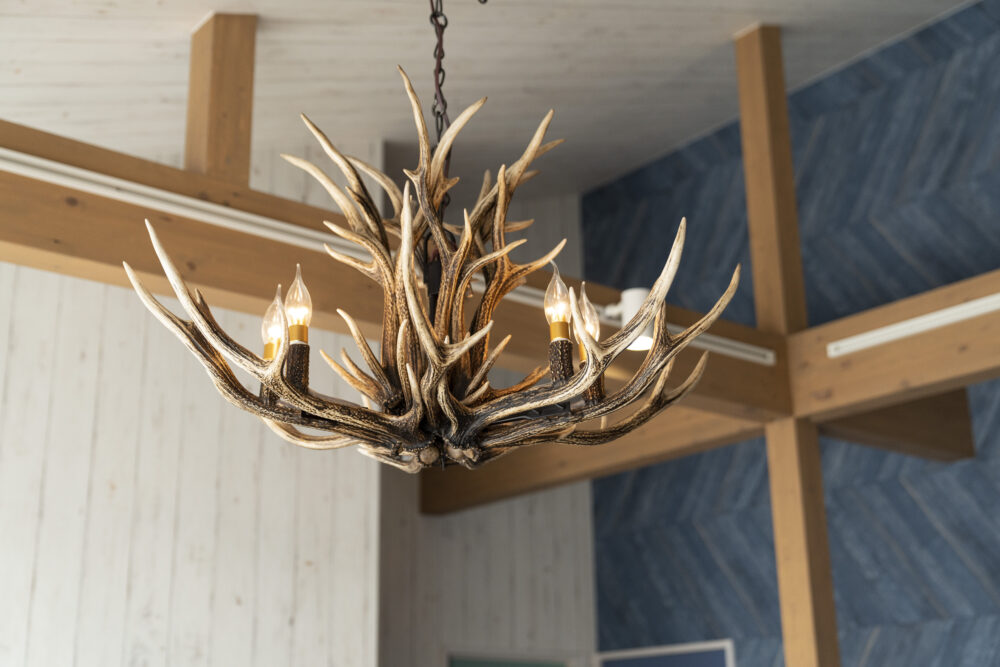 2世帯が住まう、広々とした家。LDKを各階に配置し各世帯の要望をぎゅっと詰め込みました。お客様こだわりの照明は、本物の鹿の角を使ったオーダーメイドだそう。