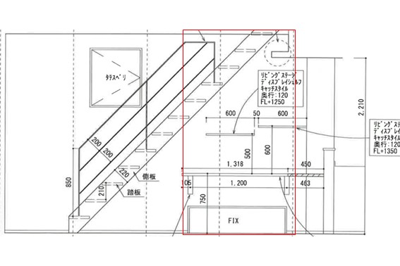 まず一番下のFIXと書かれている部分、これは明り取りの窓です。(FIX窓というのは開け閉めのできない窓です。)とても低い位置に取り付けている為、お子さんがいたずらで開けたりできない窓の形状にしながら光は取り込めるよう計画しています。