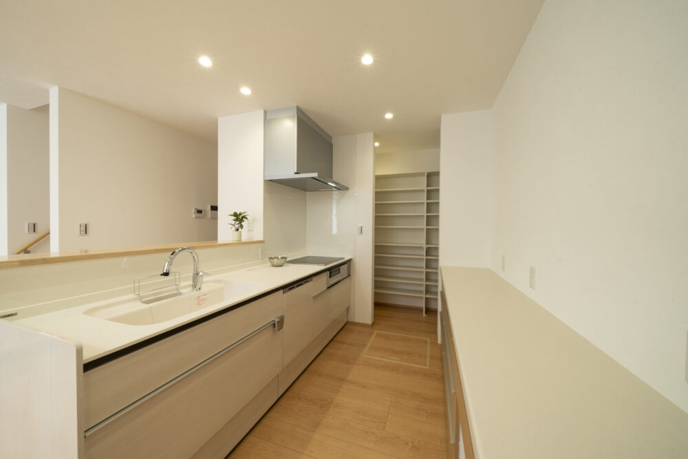 キッチンの奥には、食料品や生活必需品を収納できるパントリーも完備されておりとても便利ですね。