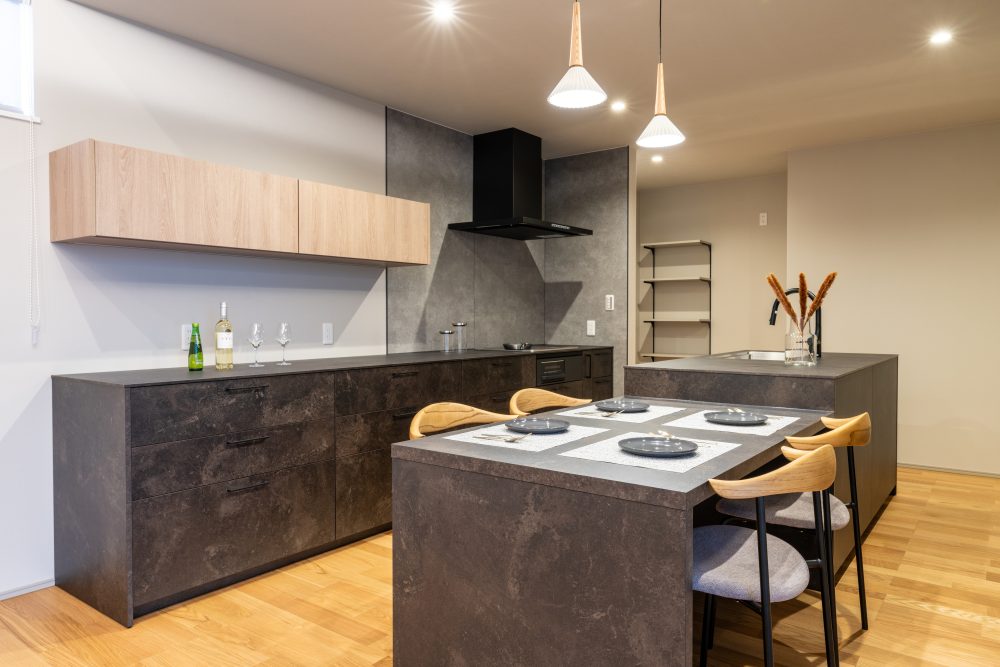 グラフテクトのキッチンと一体になったダイニングが中心となっており、調理も家族との時間もスムーズに楽しめる設計です。