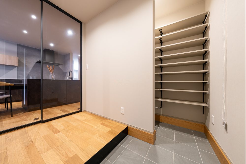 ガラス張りの引き違い戸はリビングまで見渡せる玄関となっております。
