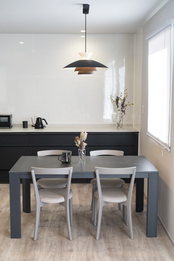 グレーのダイニングテーブルはどんな空間にもなじみ、周りを引き立ててくれます。