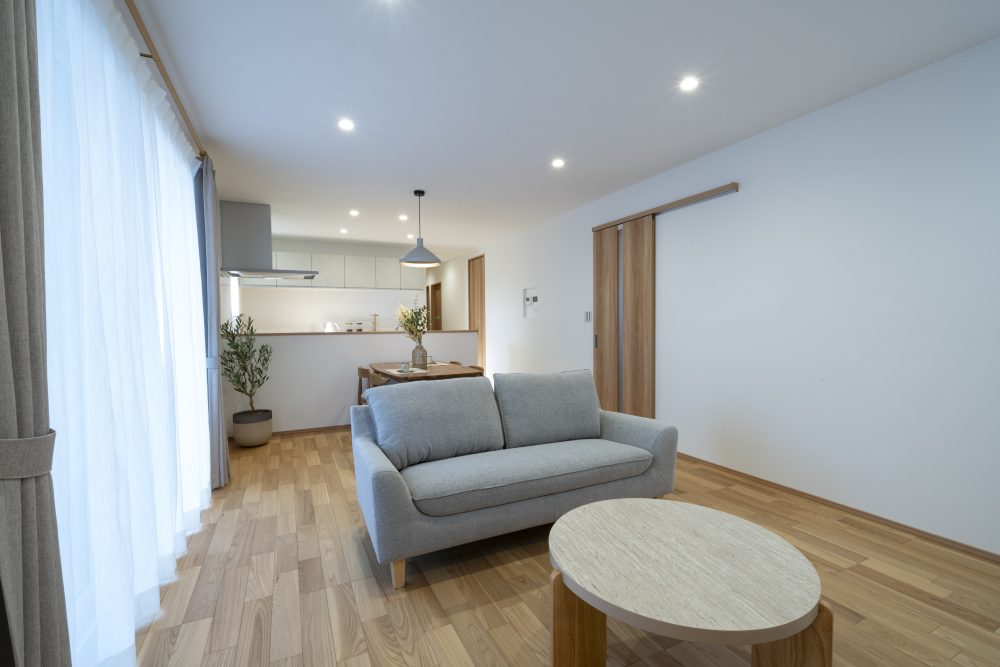 ホワイト・木目を基調としたシンプルモダンなリビングです。