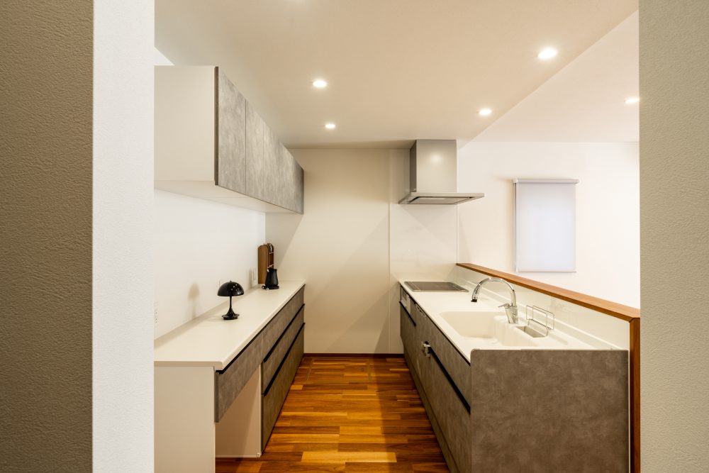シンプルで洗練された印象の白とグレーのキッチンです。収納力も抜群です。