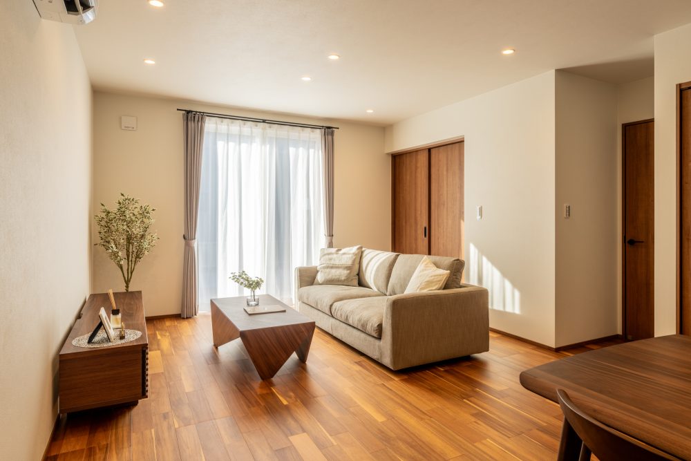 木目調を基調としたリビングは自然な温かみと落ち着きのある雰囲気を演出します。