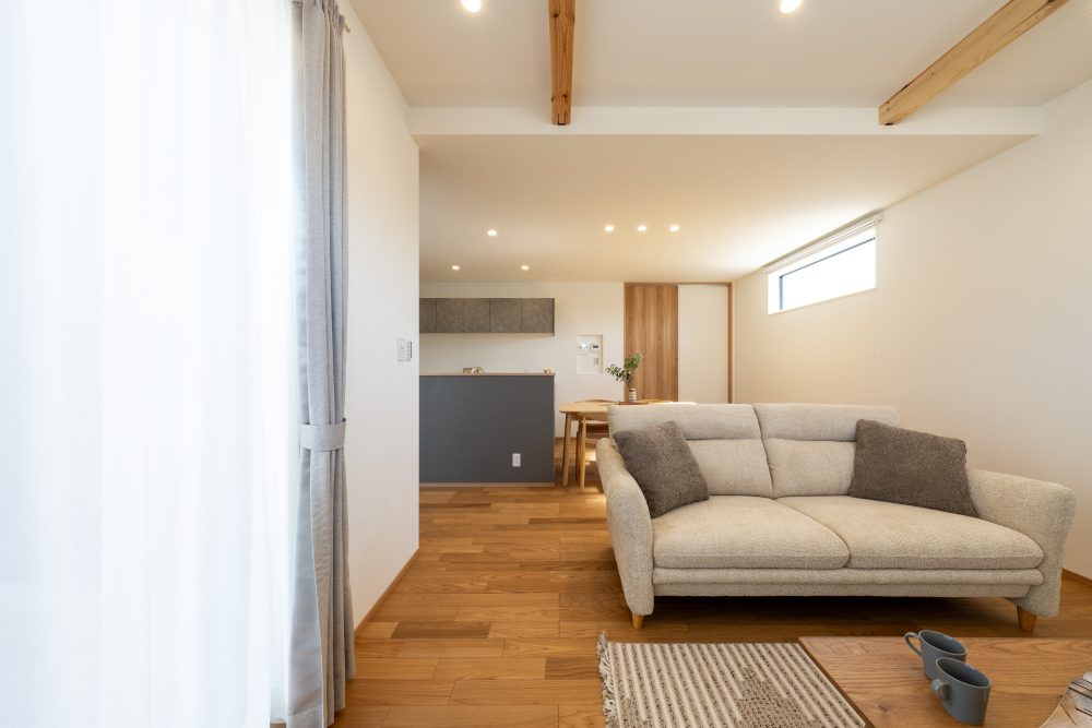 リビング部分は天井高を上げて梁見せ天井に。天井高をあげる事で開放感も◎。