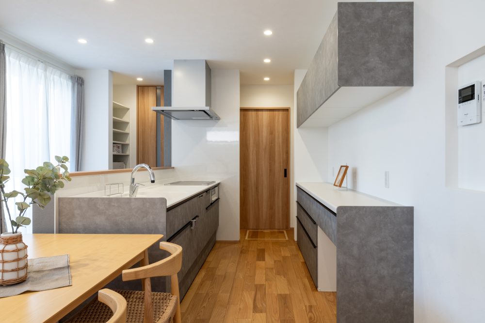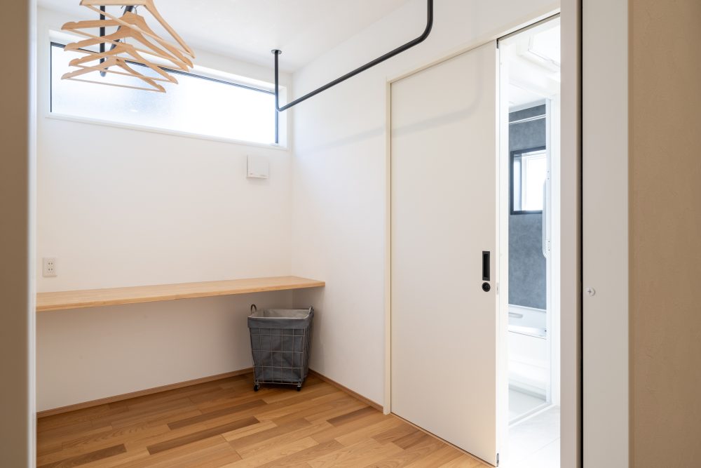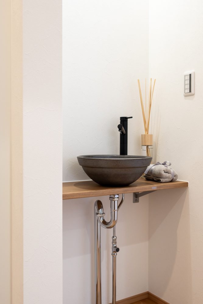 玄関を入ってすぐ左側に、コンパクトな手洗いスペースを。外から帰って、ドアノブやスイッチに触れる前にサッと手を洗える動線は、今の住まいづくりに欠かせないポイントです。