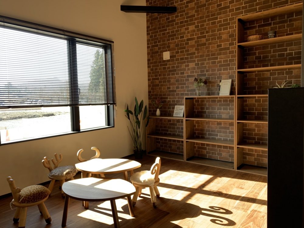 家具屋さんで見つけたかわいい小椅子とテーブルを配置し、お子様がそこで絵本を読んだり、遊んだりできるようなスペースを目指しました。