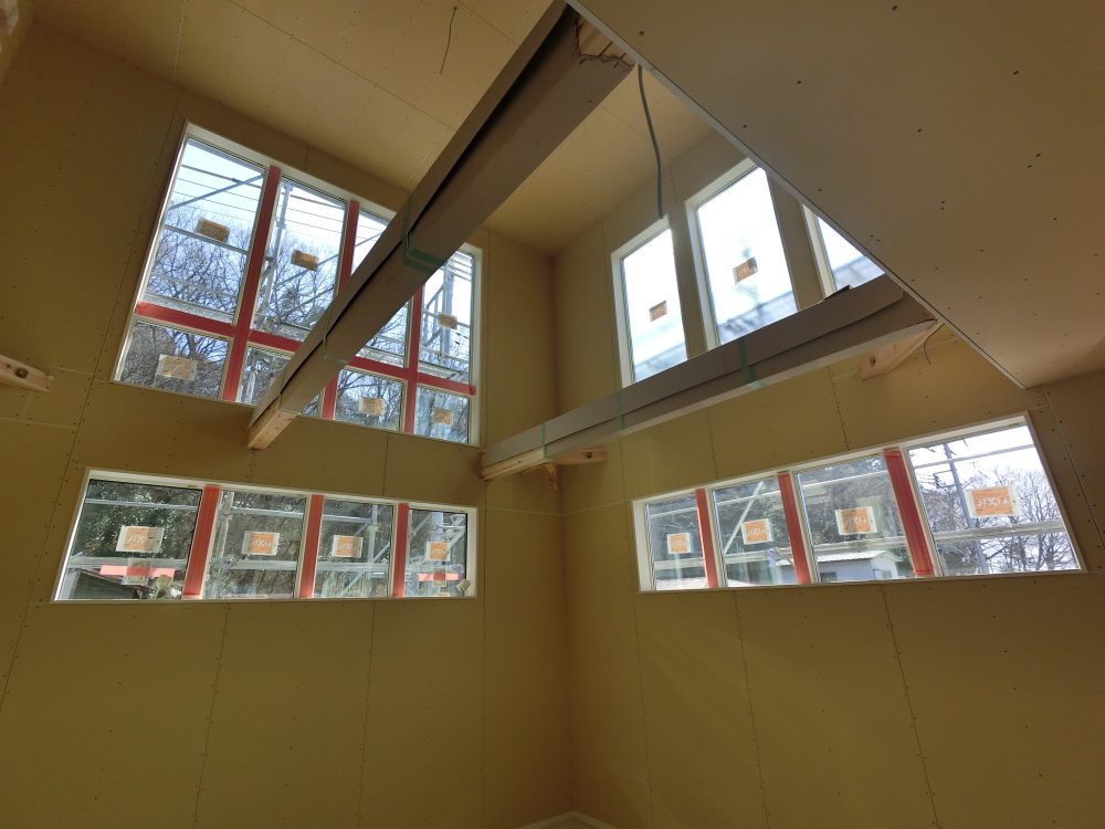 リビング上部の吹き抜けの様子です。吹き抜け部分の2面にたくさんの窓を設置することで明るい日差しが部屋全体に差し込んできます。