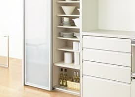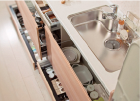 キッチンからあちこち移動せずにスッキリと片付けられます。収納力があって出しやすい仕様です。