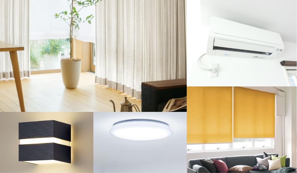 水まわり・省エネ・セキュリティに関する設備はもちろんのこと、むぎくらでは、カーテン・照明・エアコンといった生活必需品まで標準装備。すぐに新しい暮らしをはじめてほしいと願う、むぎくらの心配りが光る「こみこみコーディネート」です。