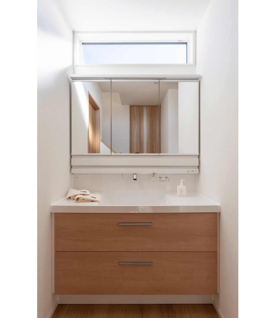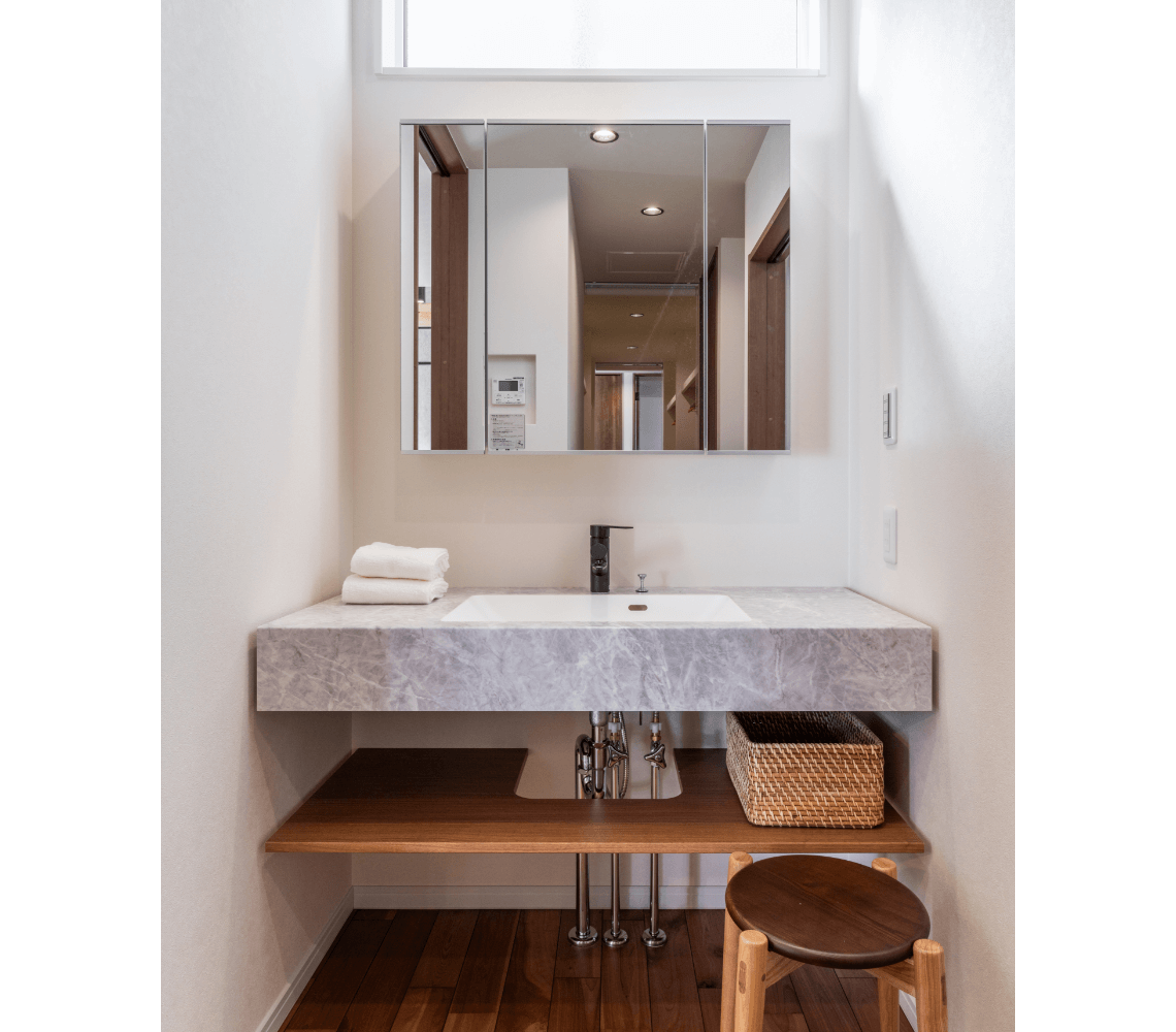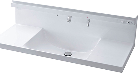 顔を洗う際にタオルや眼鏡を仮置きできる広々としたスペースを確保しつつ、カウンターのつなぎ目をなくすことにより、拭き掃除などのお手入れが簡単にできます。