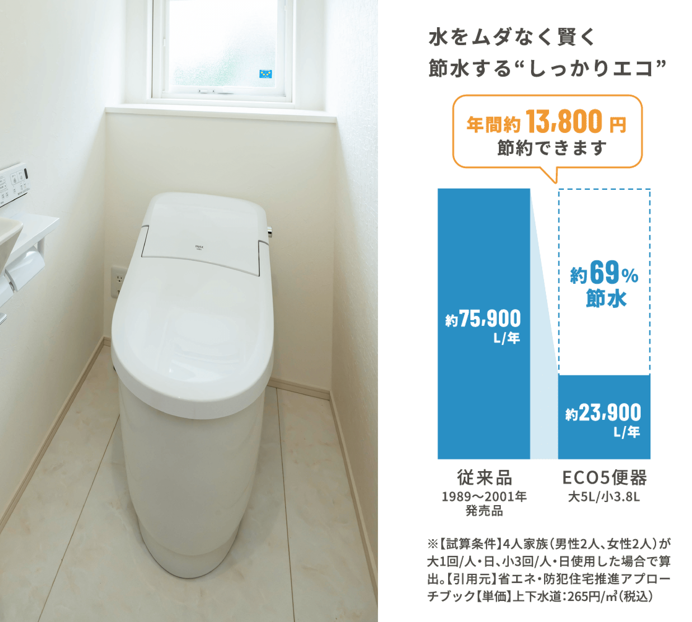 フチレス形状に加え、掃除のしやすさにこだわった機能も充実。大切な水を無駄なく賢く使う超節水トイレです。