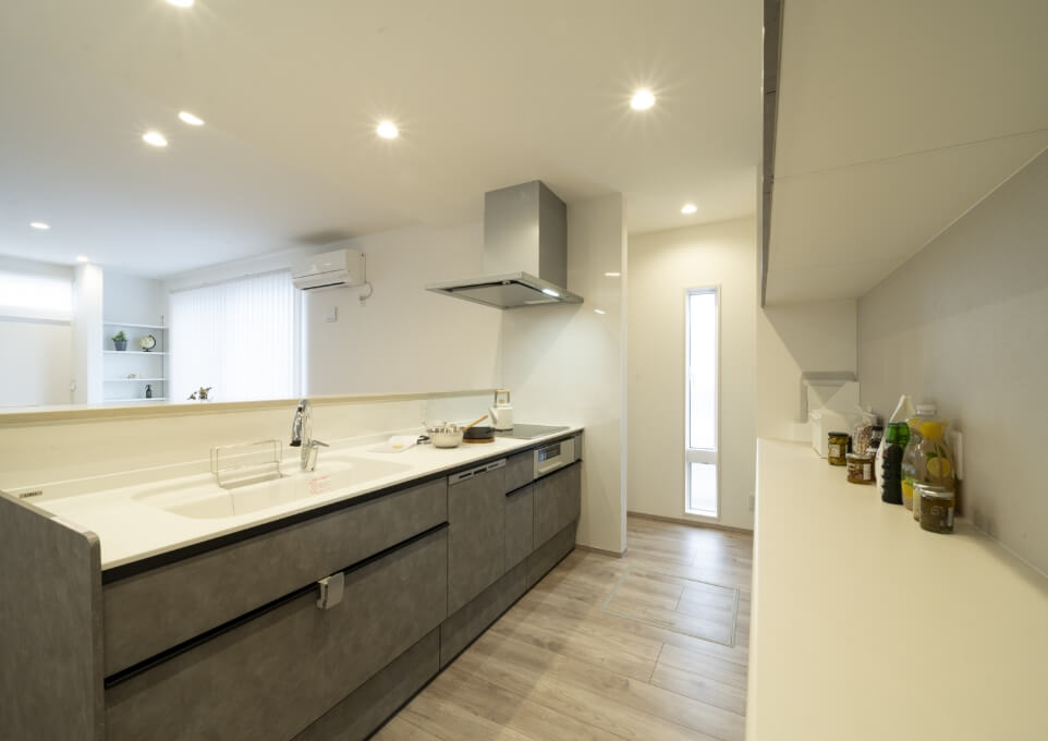 背面や足元はもちろん家電用のスペースなど収納が充実。食器洗い乾燥機やIHヒーター・人造大理石のワークトップなど掃除や後片付けの機能性も抜群です。