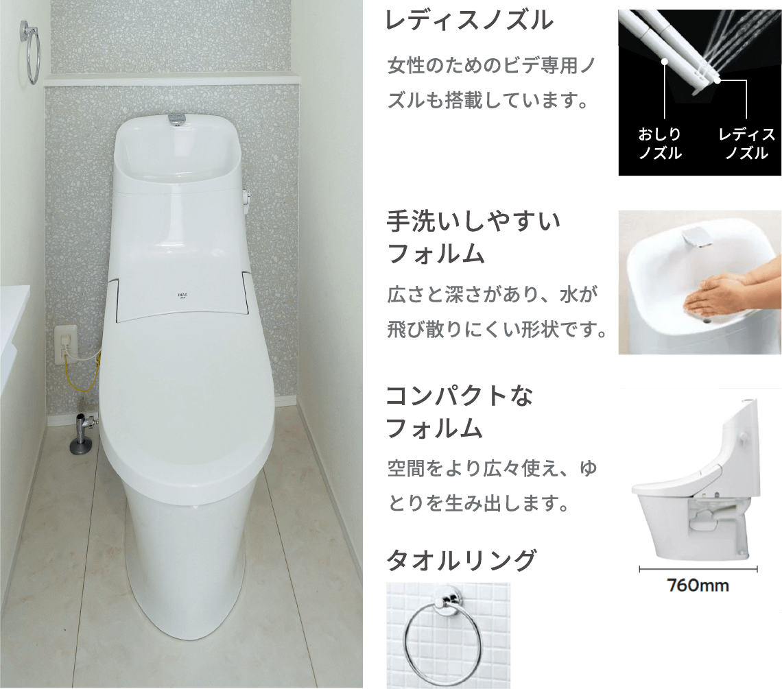 コンパクトなフォルムのトイレ。汚れが落ちやすく水アカがつかない100年クリーンのアクアセラミックを採用。さらにオート便器洗浄機能付。