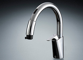 一般的な水栓より水が溜まりにくい「キレイアップ水栓」は、汚れがつきにくく拭き掃除の手間がほとんどありません。