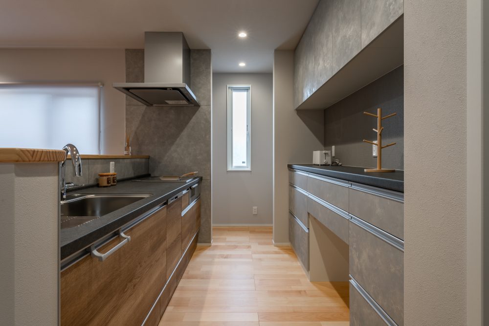 キッチンは手元をかけせるように壁を立ち上げています。