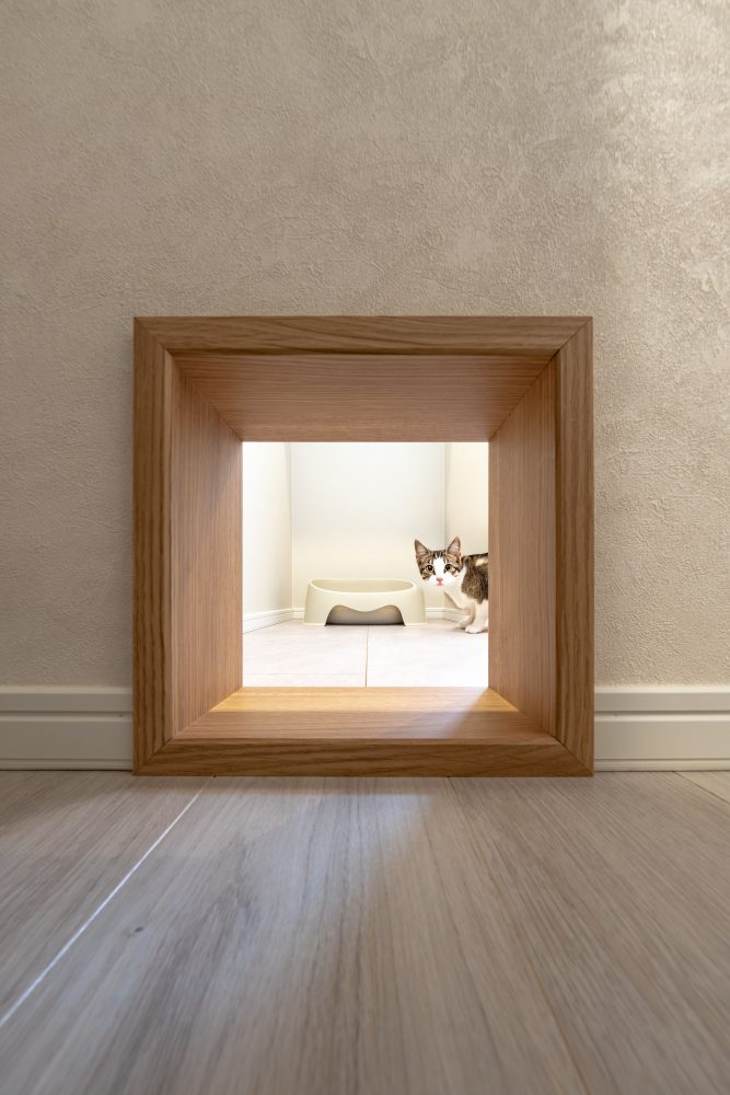 階段下の空間を活かした猫専用スペースは、 人の動線から少し離れた落ち着ける場所です。