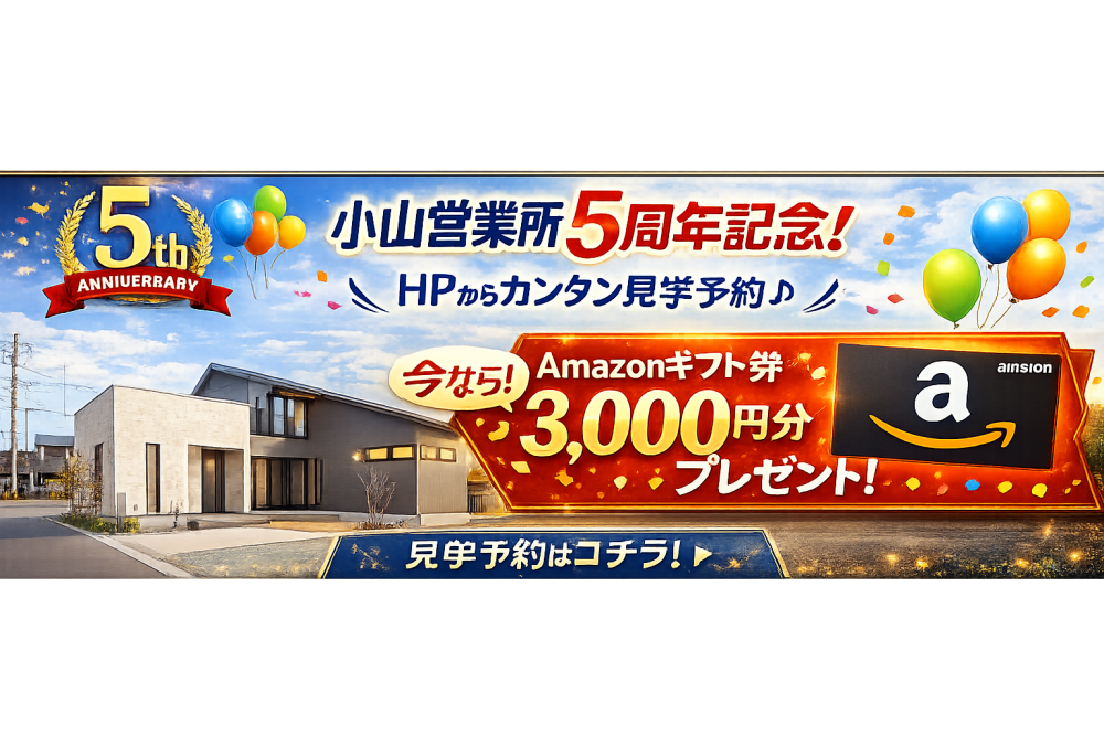 尚、このサイトから見学のご予約をしていただいた方には小山営業所開設5周年記念といたしまして、3,000円分のアマゾンギフトをプレゼントしております。