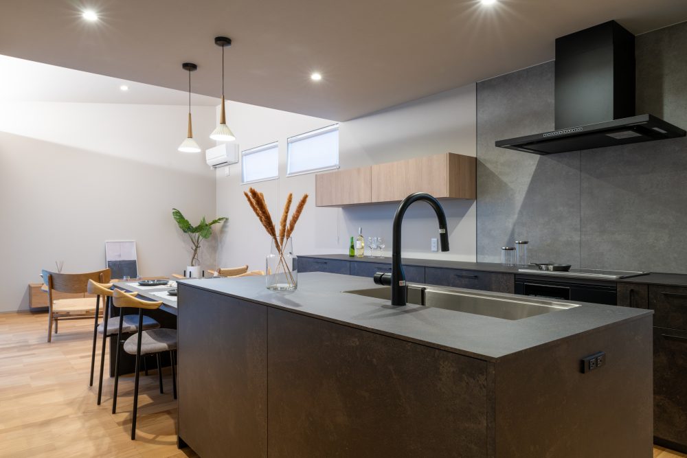グラフテクト製キッチンが中心に配置され、ダイニングやリビングと一体に。