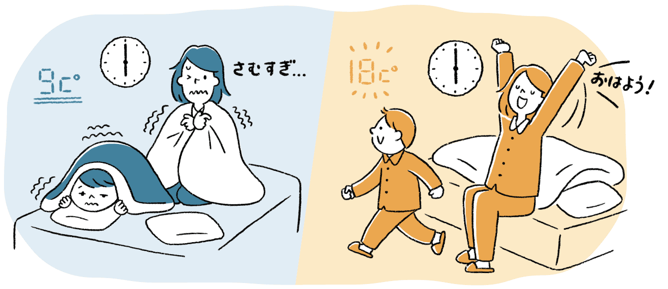 - 低音により引き起こされる様々な症状。その大きな原因となる室内の温度が改善されると、病院に通う時間と医療費の削減だけでなく、家族みんなの心が元気になります。