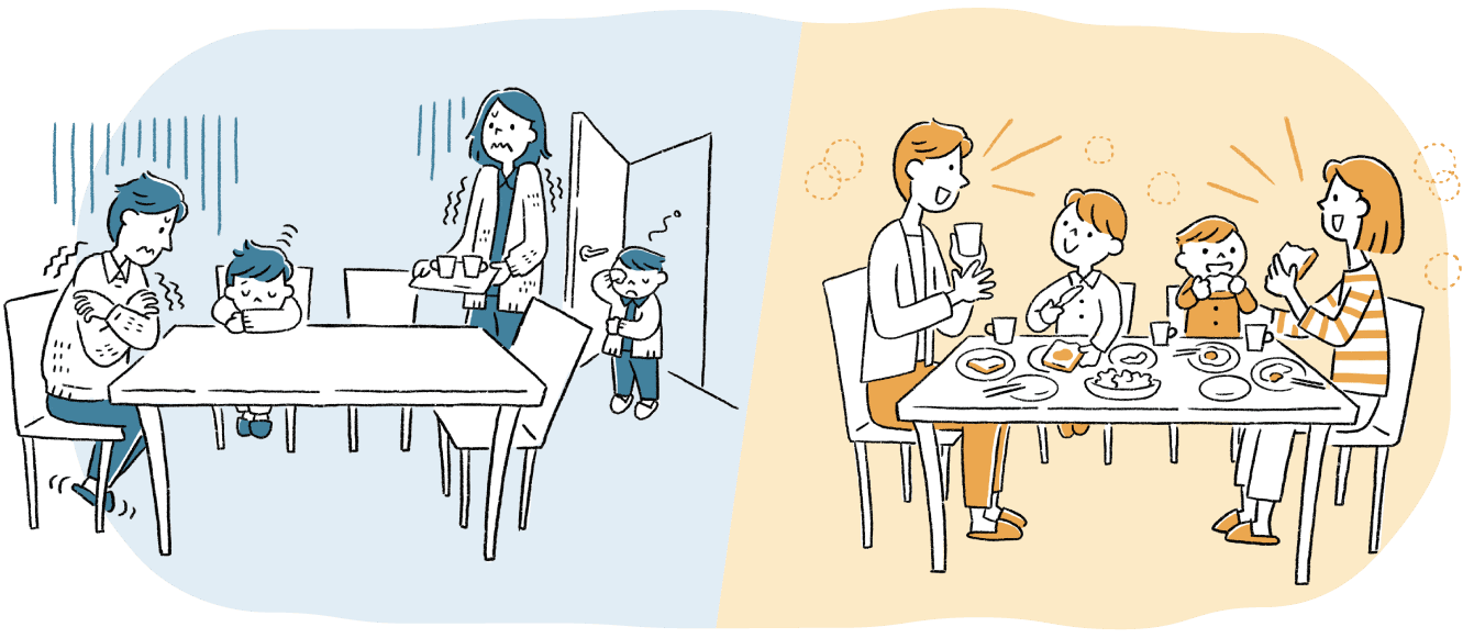 元気に起きてくる - パパの出勤時間は早い。でも子どもたちも早起きして家族揃って朝ご飯。