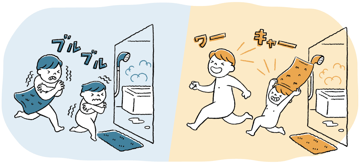 すぐお風呂へ… - 服のぬくもりを抱いて浴室へダッシュ。ステンと転ばないようにご注意を。