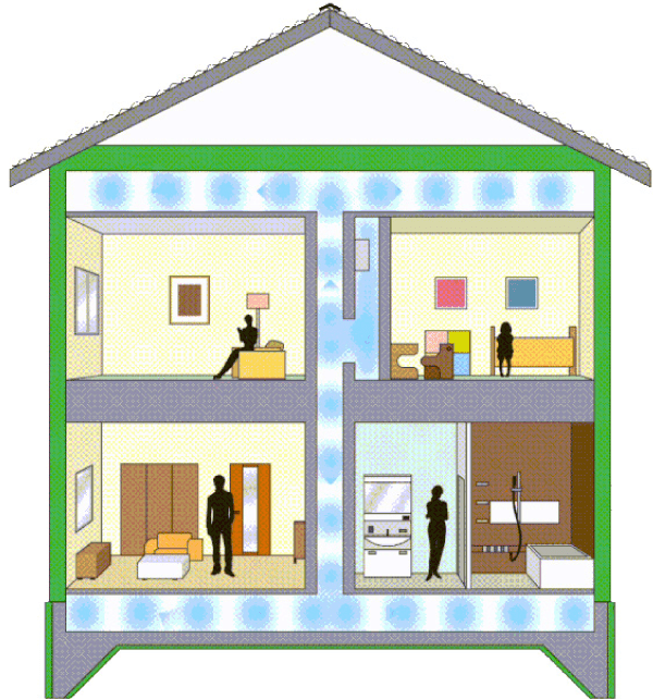 外部から取り込んだ空気を、室内に入る際に顕熱交換型換気装置によって一度加熱(冷却)。エネルギー効率が良く、冷暖房費を削減します。