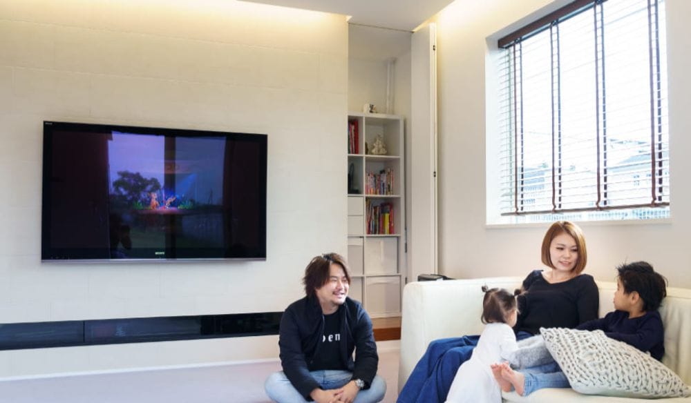 リビングの壁掛けテレビの下には、TVボードが埋め込まれ、その壁の裏側には、細長い収納スペースが設けられています。TVボードの出っ張りをなくすことで、空間を広く使える上に、見た目にもスッキリ。また、壁裏収納は、子どもたちのおもちゃなどの手軽にしまえるので、お部屋を綺麗に保てるそうです。