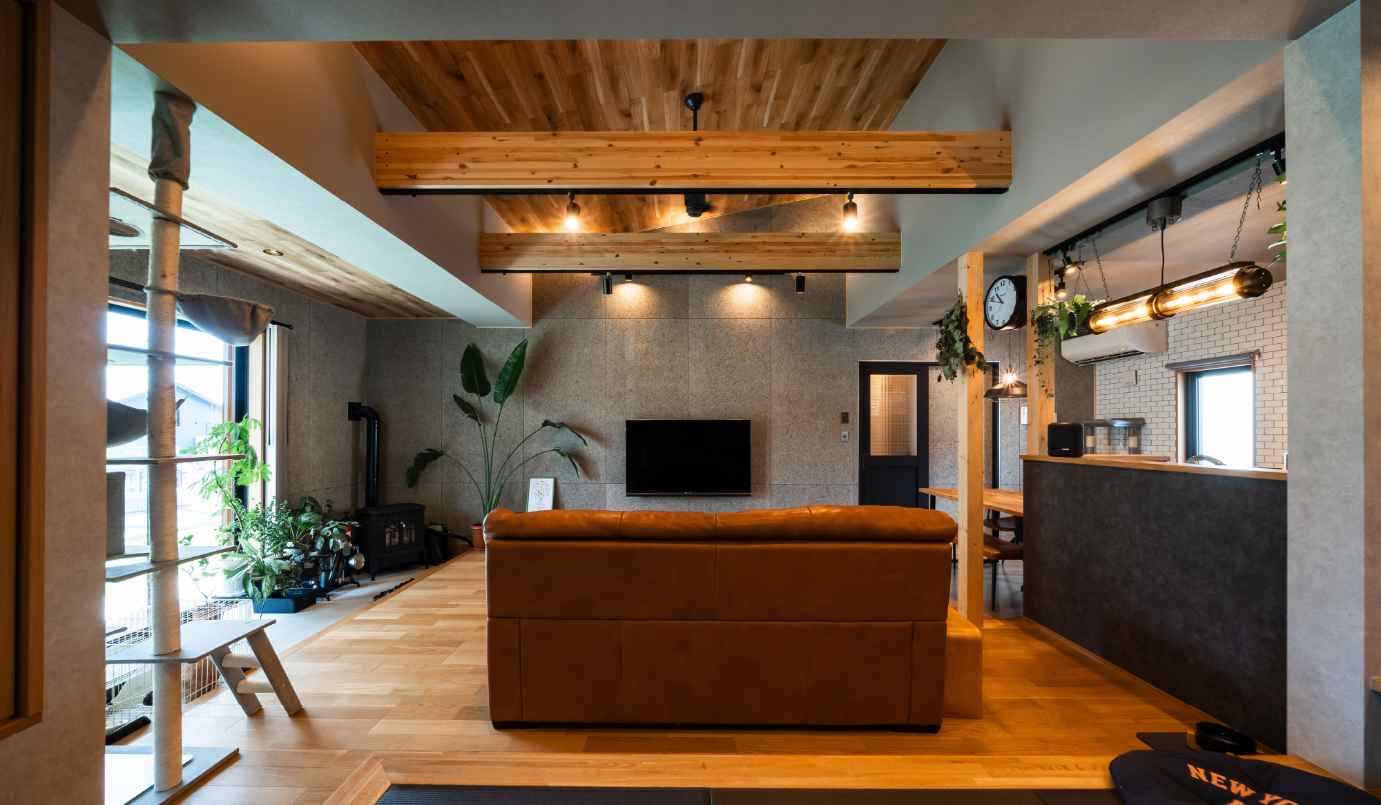 梁に取り付けたスポットライトが人に居場所を生み出す。開放的な空間と居心地の良いパーソナルなスペースが共存するリビング。