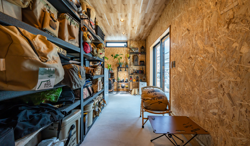 大容量の壁面収納があるから趣味のアウトドア用品も難なく収納できる。