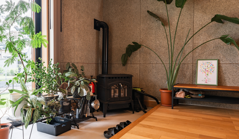 コンクリートと木材の質感によく馴染む、こだわりの薪ストーブ。