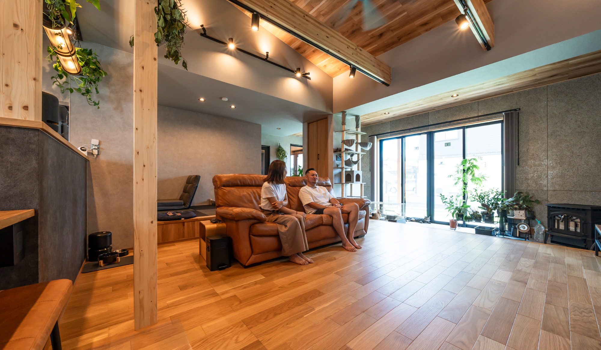 梁に取り付けたスポットライトが人に居場所を生み出す。開放的な空間と居心地の良いパーソナルなスペースが共存するリビング。