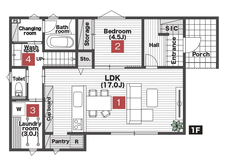 シューズクローゼットやパントリーなどの充実した収納に加え、広々としたランドリールーム、家事の時短ができる動線設計など、忙しいママにうれしい間取りとなっています。