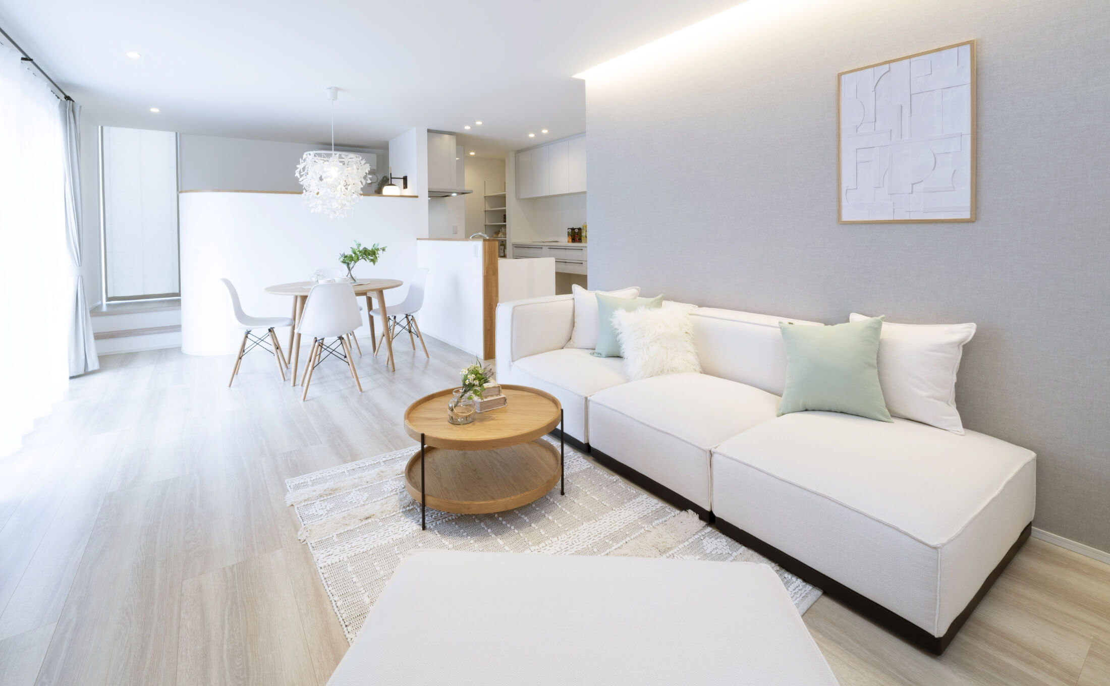 女性なら誰もが憧れる「海外ドラマのようなおしゃれな家」をコンセプトに、インテリアイメージは「 ナチュラルシック」。白をベースにグレイッシュな色合い、花やグリーンの映えるやさしいナチュラルシックなインテリアで統一しました。白の中にところどころ木の素材色を入れたり、アクセントウォールの色を他と変えることで、シンプルでありながらも単調になりすぎないよう、家自体にも少し個性を持たせています。